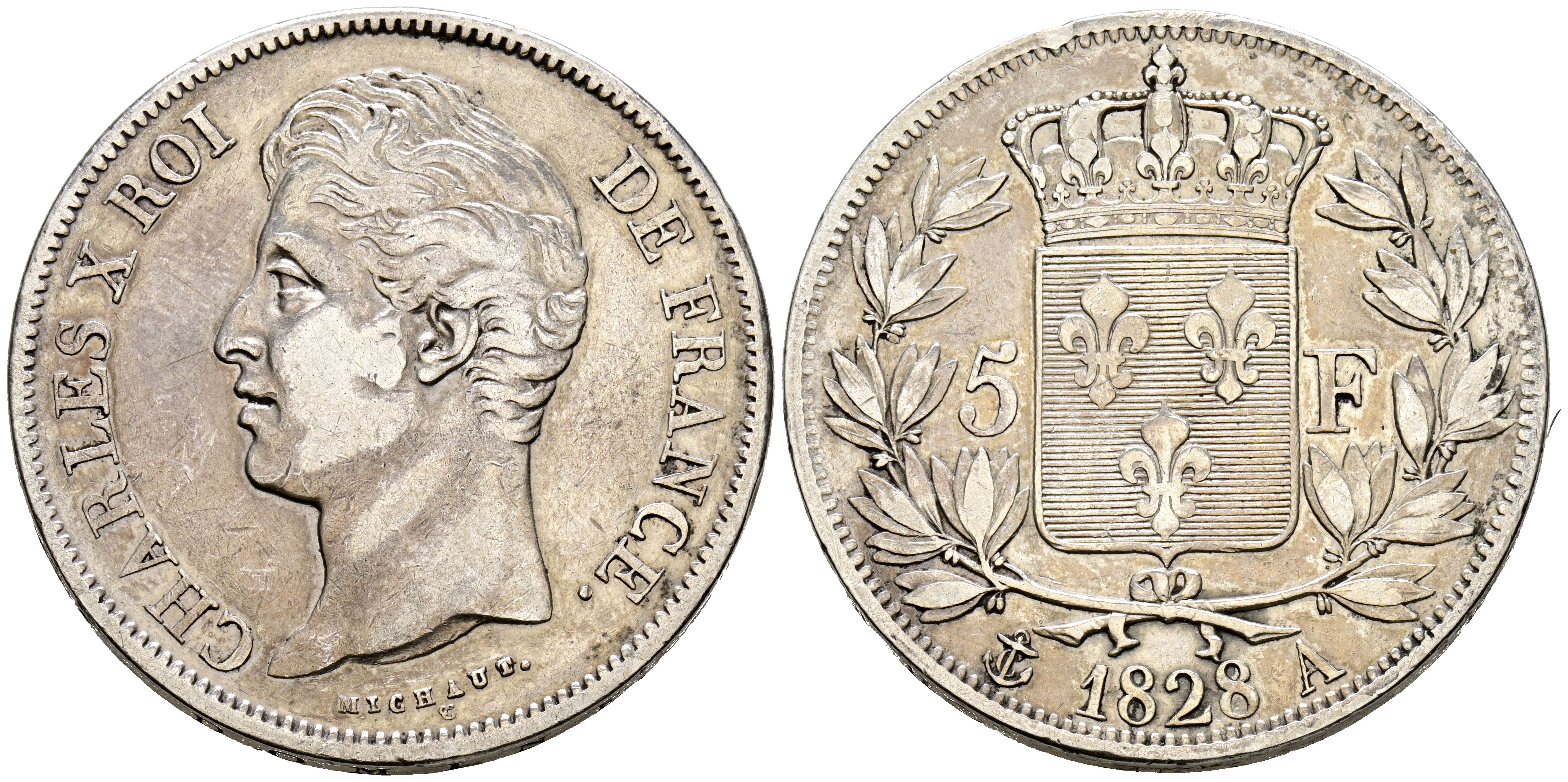FRANCIA, Carlos X. 5 Francs (Ar. 24,82g/37mm). 1828. París. A. (Km#728.1). MBC.
