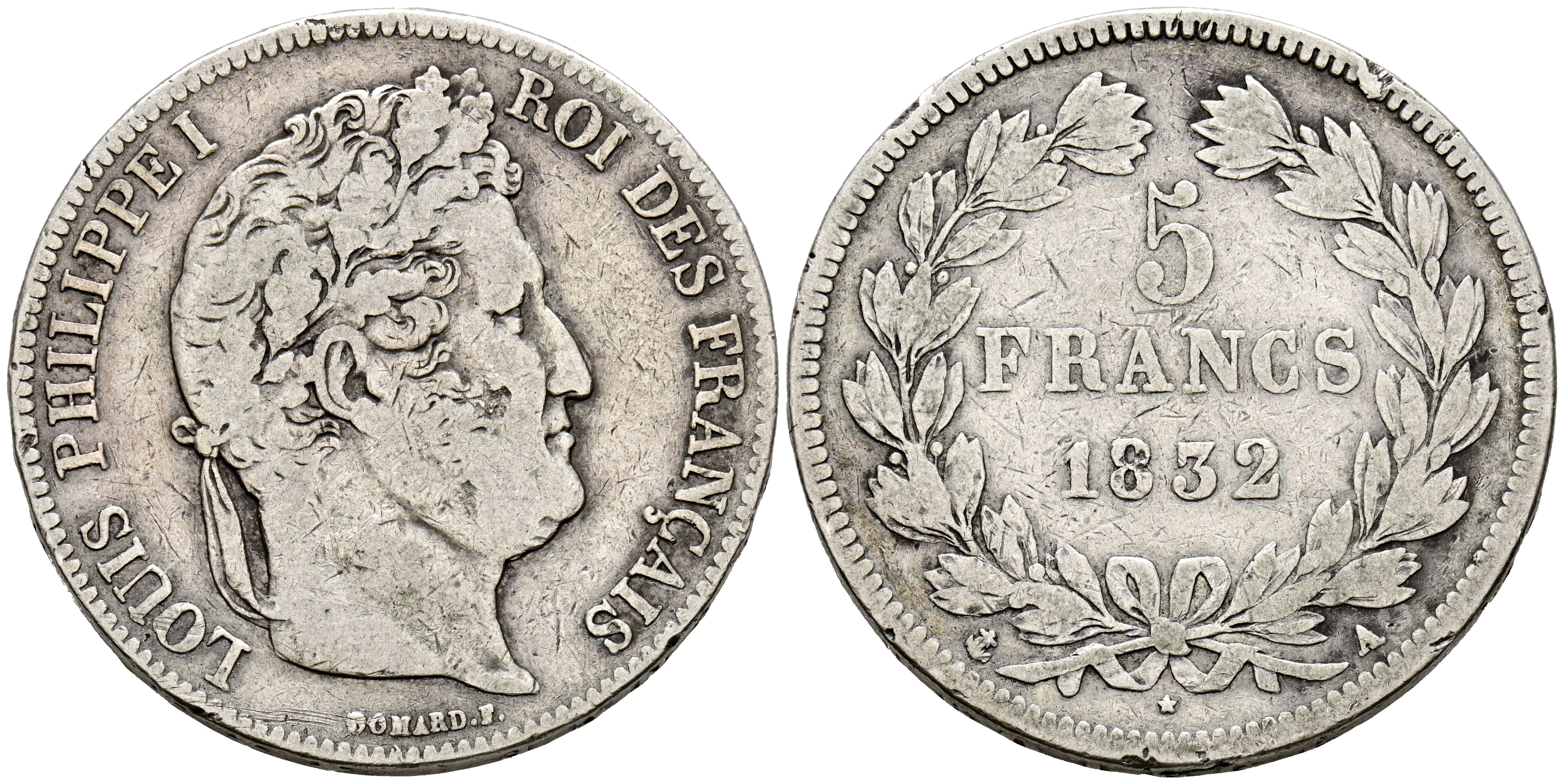 FRANCIA. 5 Francos. (Ar. 24,57g /37mm). 1832. Luis Felipe I. París A. (Km #749.1). MBC-.