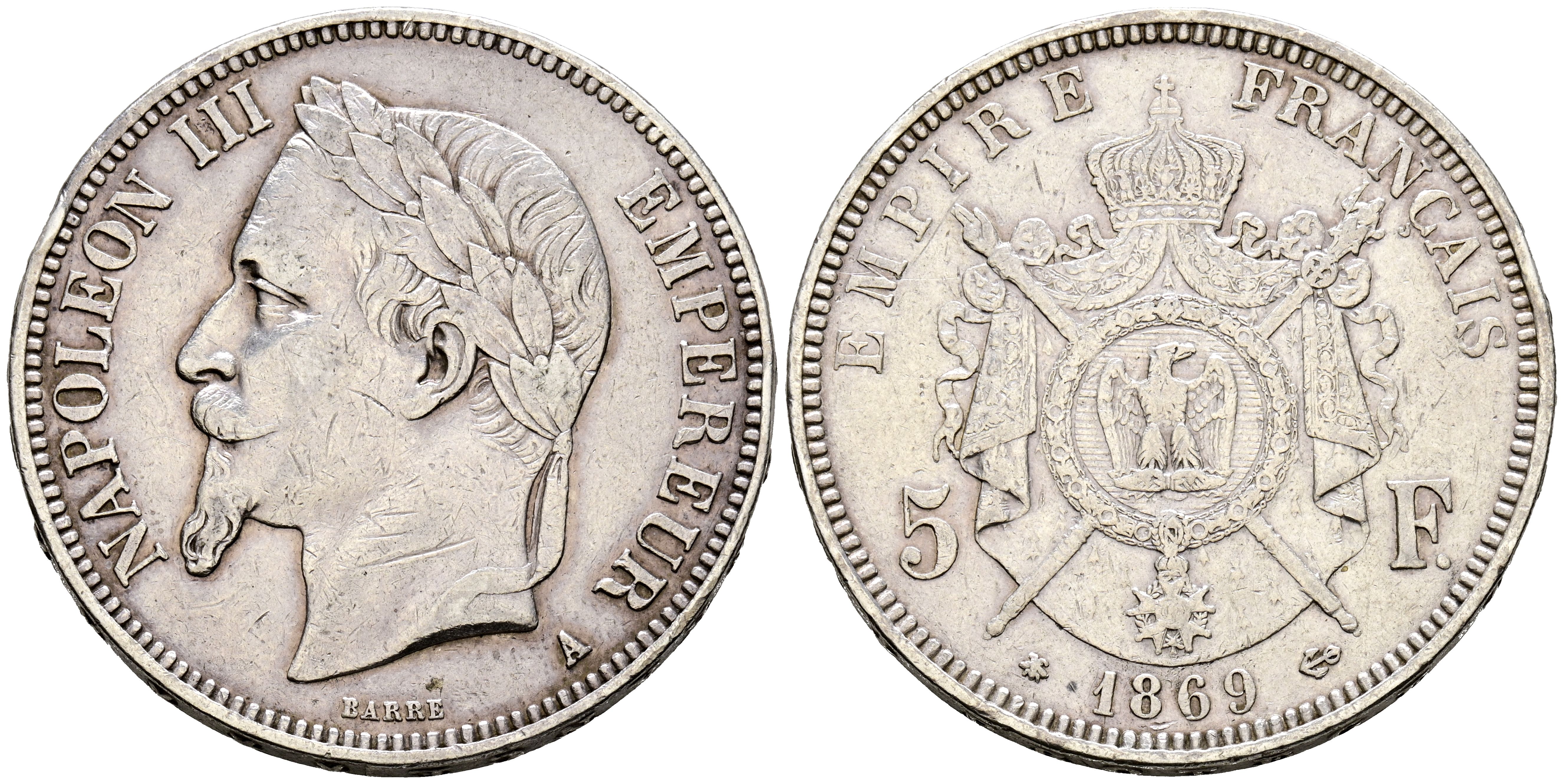 FRANCIA, Napoleón III. 5 Francs. (Ar. 24,78g/37mm). 1869. París A. (Km#799.1). MBC.