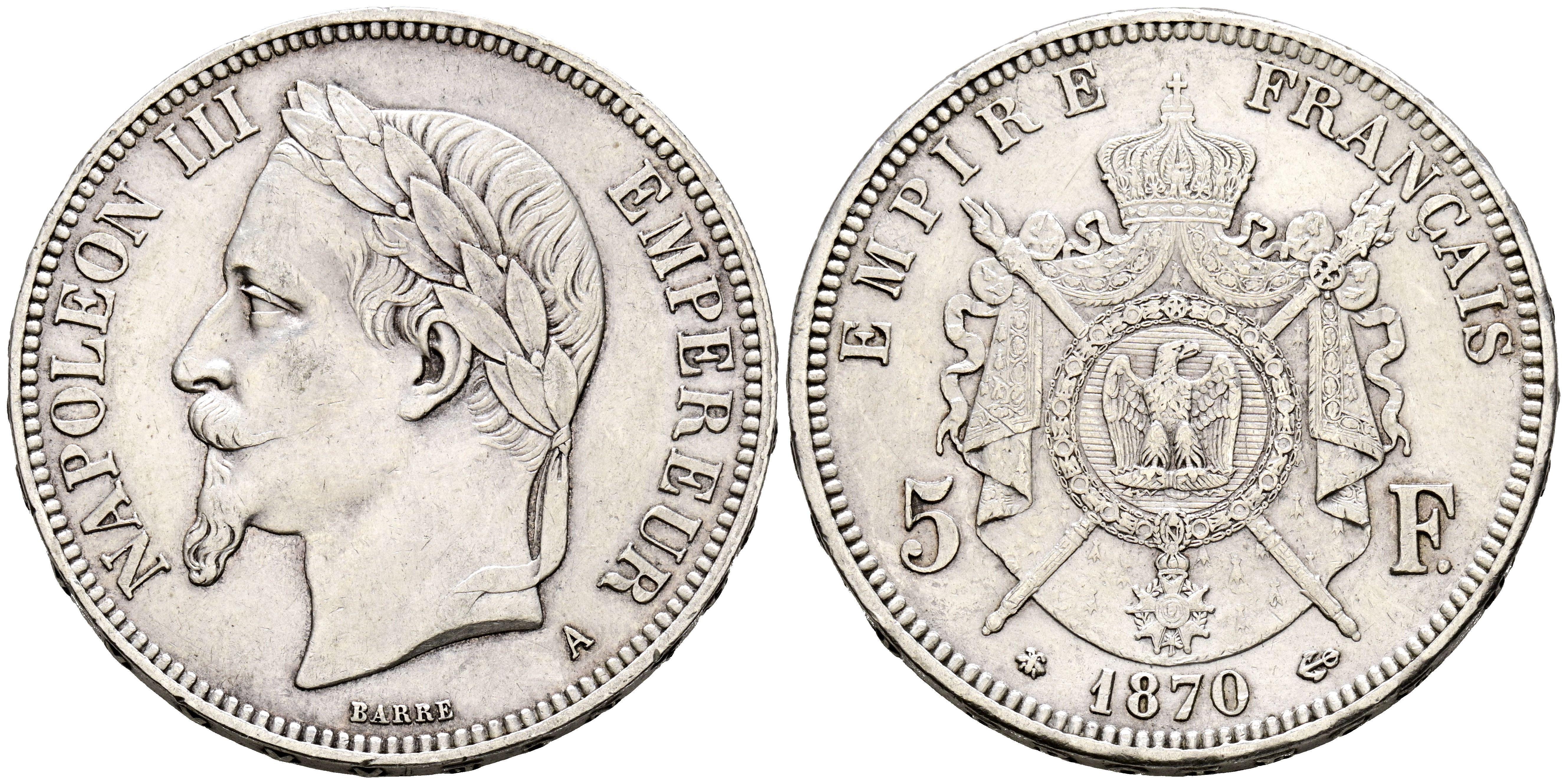 FRANCIA. 5 Francs. (Ar. 24,83g/37mm). 1870 París A. (Km#799.1). MBC+.