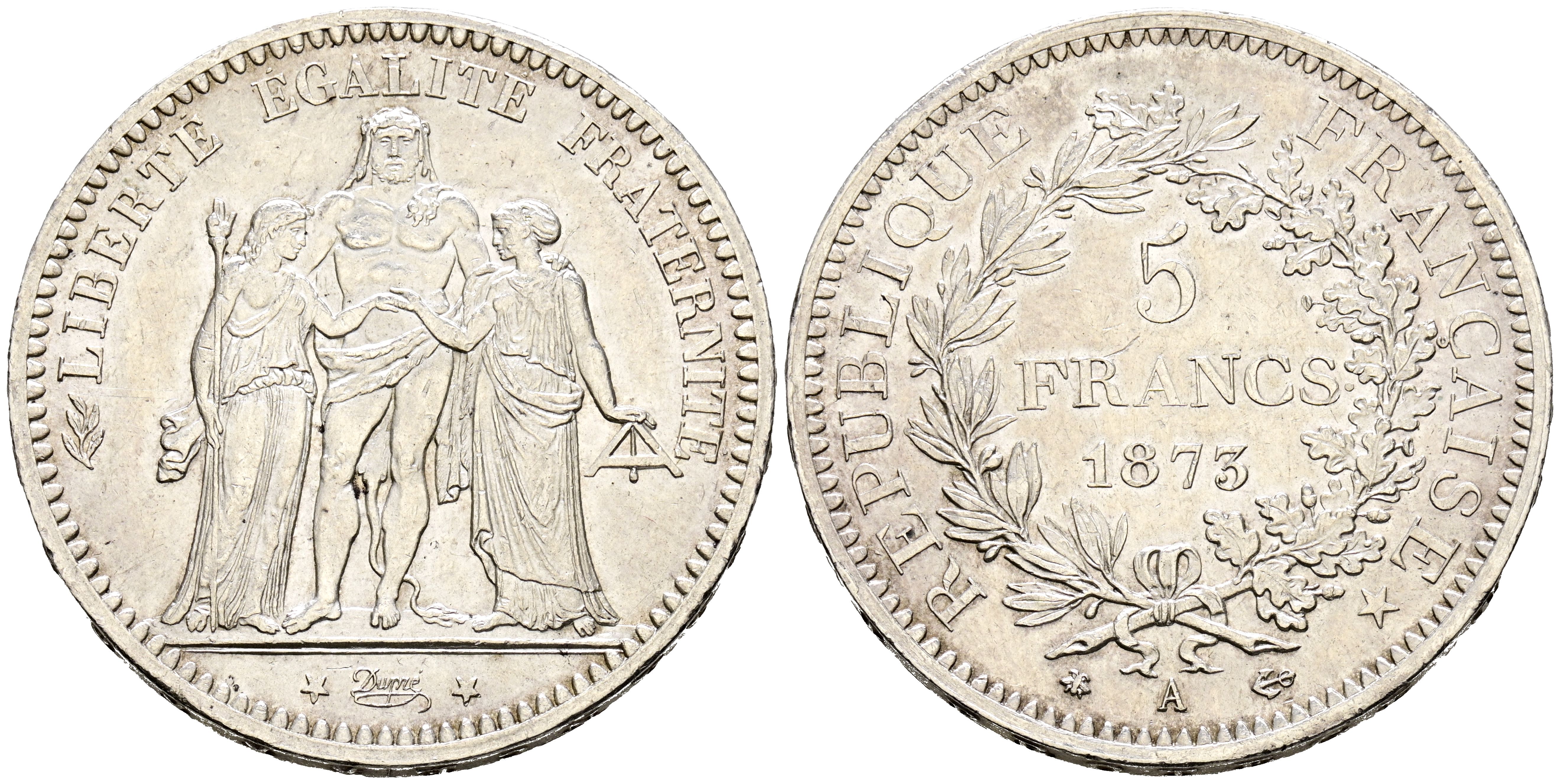 FRANCIA, III República. 5 Francs. (Ar. 25,00g/37mm). 1873. París A. (Km#820.1). EBC-. Ligeras marquitas.