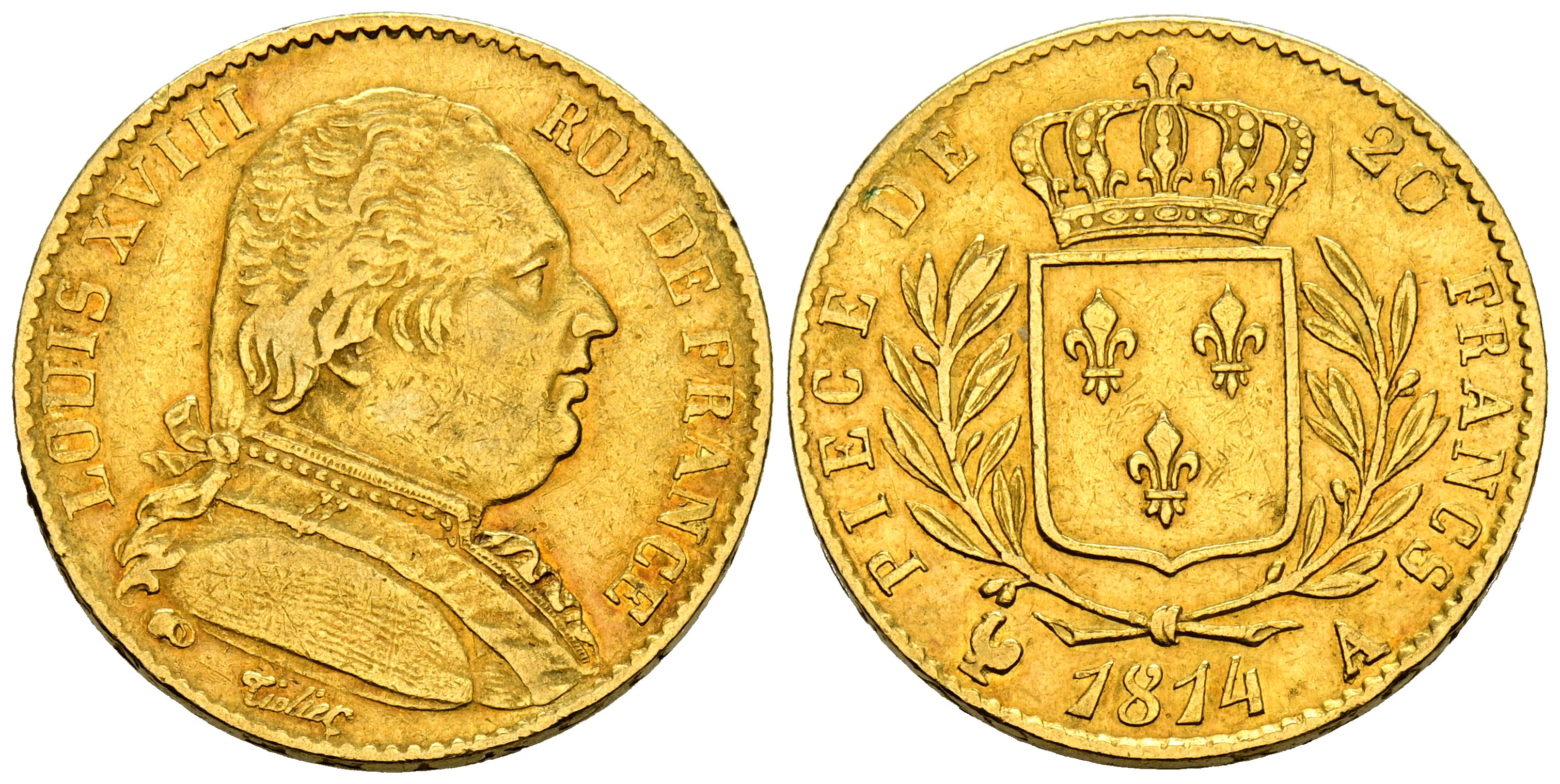 FRANCIA, Luis XVIII. 20 Francos. (Au. 6,43g/21mm). 1814. París A. (Km#706.1). MBC. Preciosa pátina.