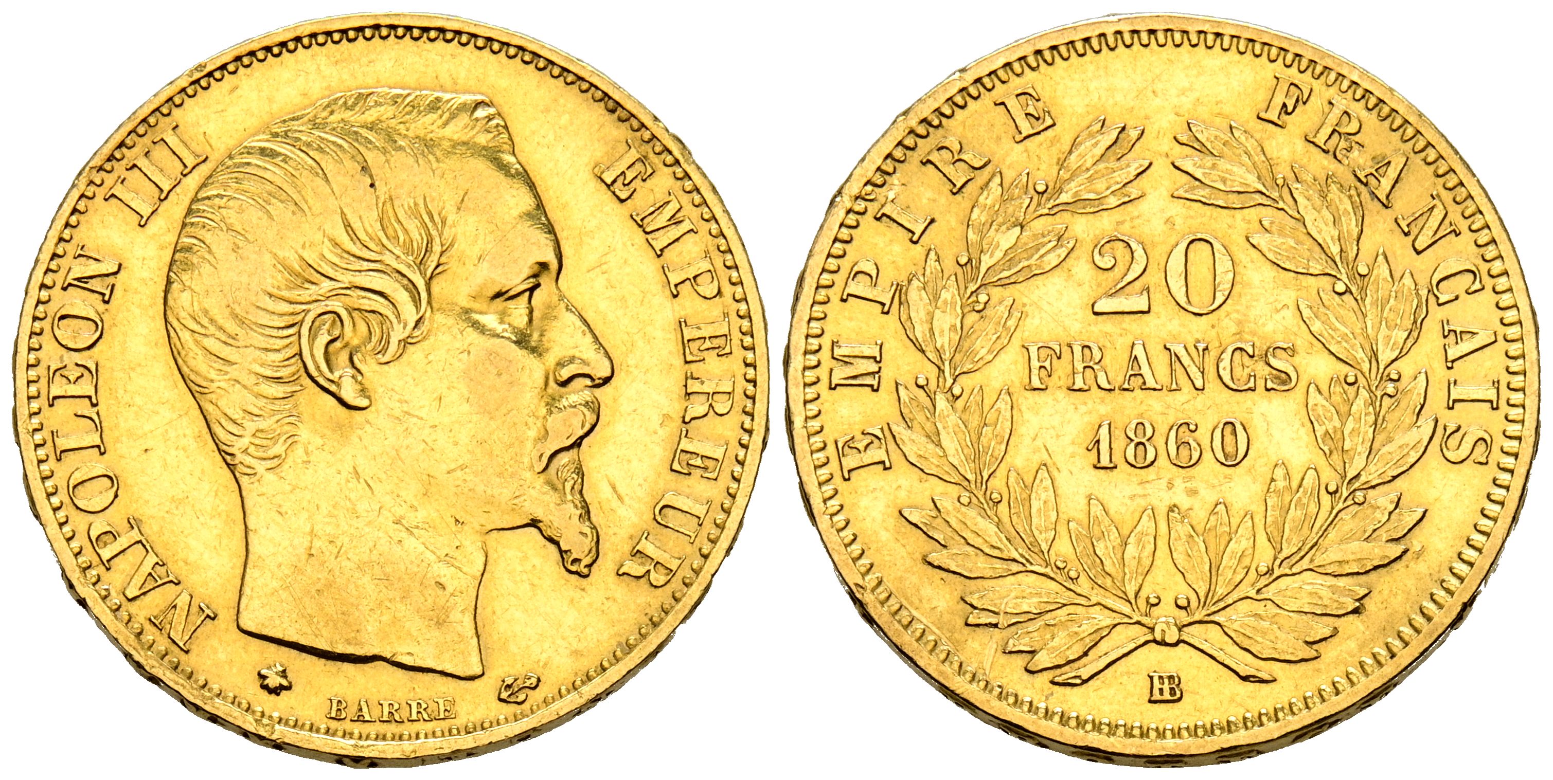 FRANCIA, Napoleón III. 20 Francos. (Au. 6,44g/21mm). 1860. Estrasburgo BB. (Km#781.2). MBC. Pequeñas marcas en el listel que nos indican que probablemente estuvo engarzada.