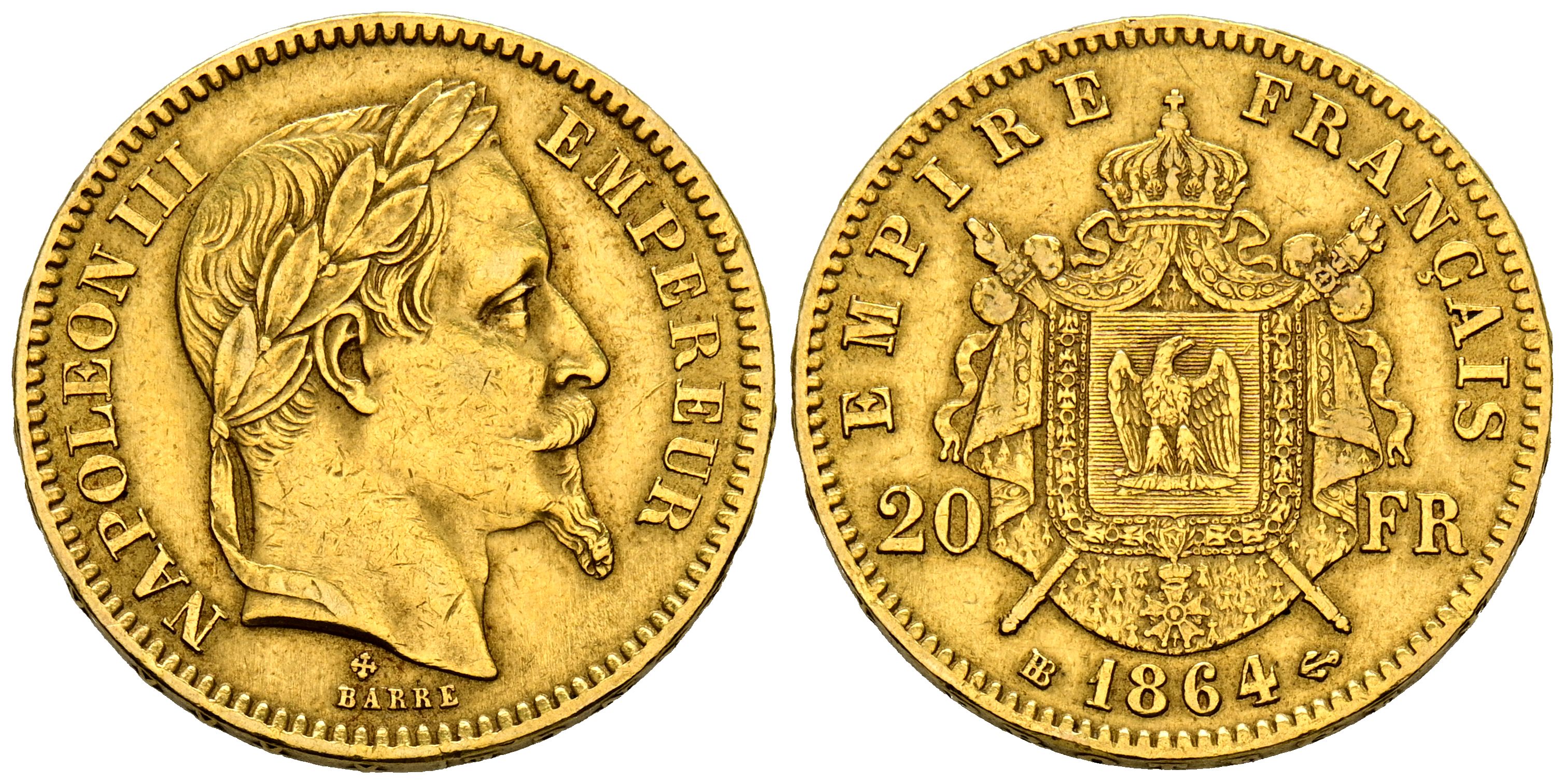 FRANCIA, Napoleón III. 20 Francos. (Au. 6,40g/21mm). 1864. Estrasburgo BB. (Km#801.2). MBC+.