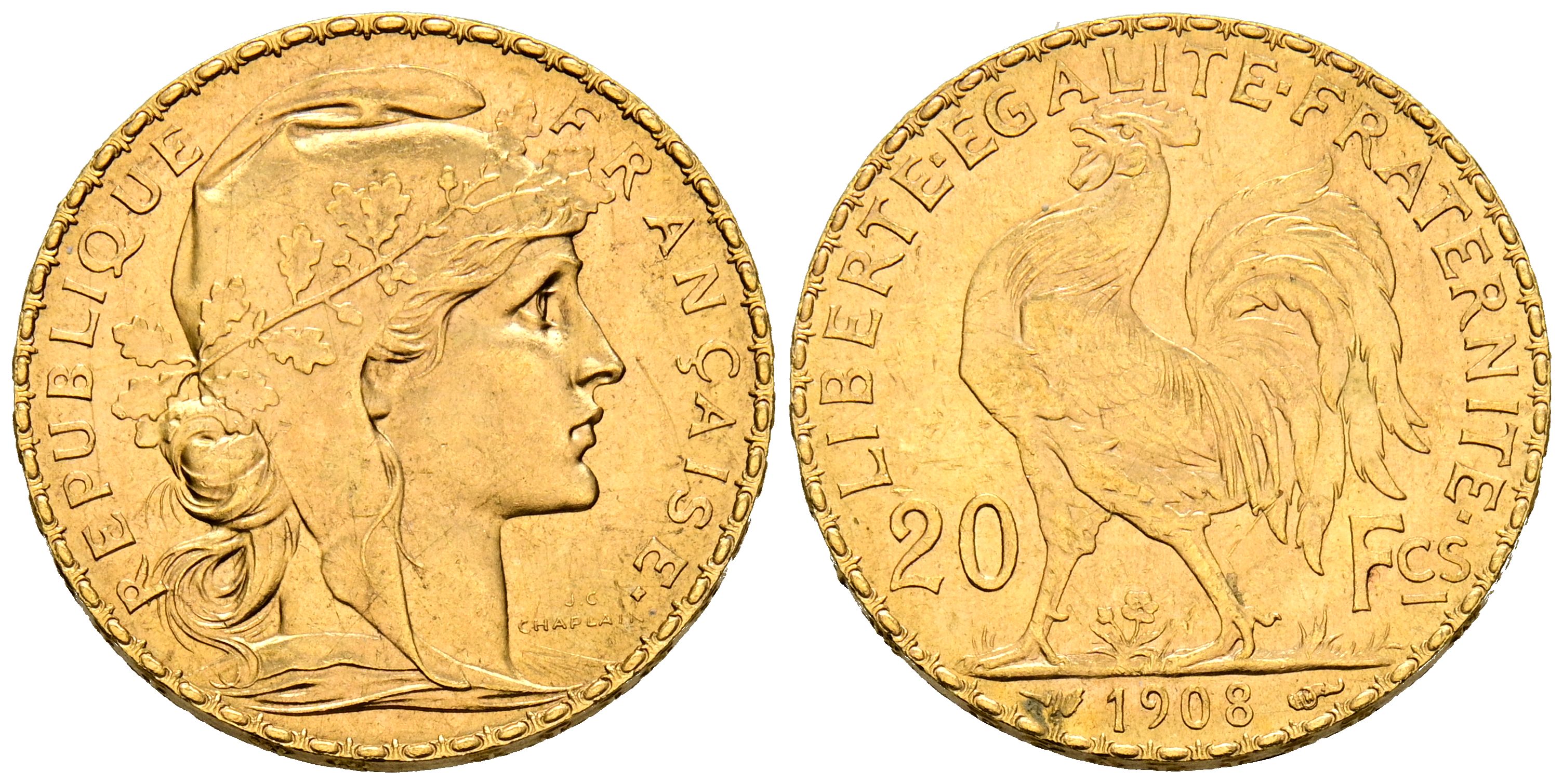 FRANCIA, III República. 20 Francs. (Au. 6,46g/21mm). 1908. París A. (Km#857). EBC+/EBC.