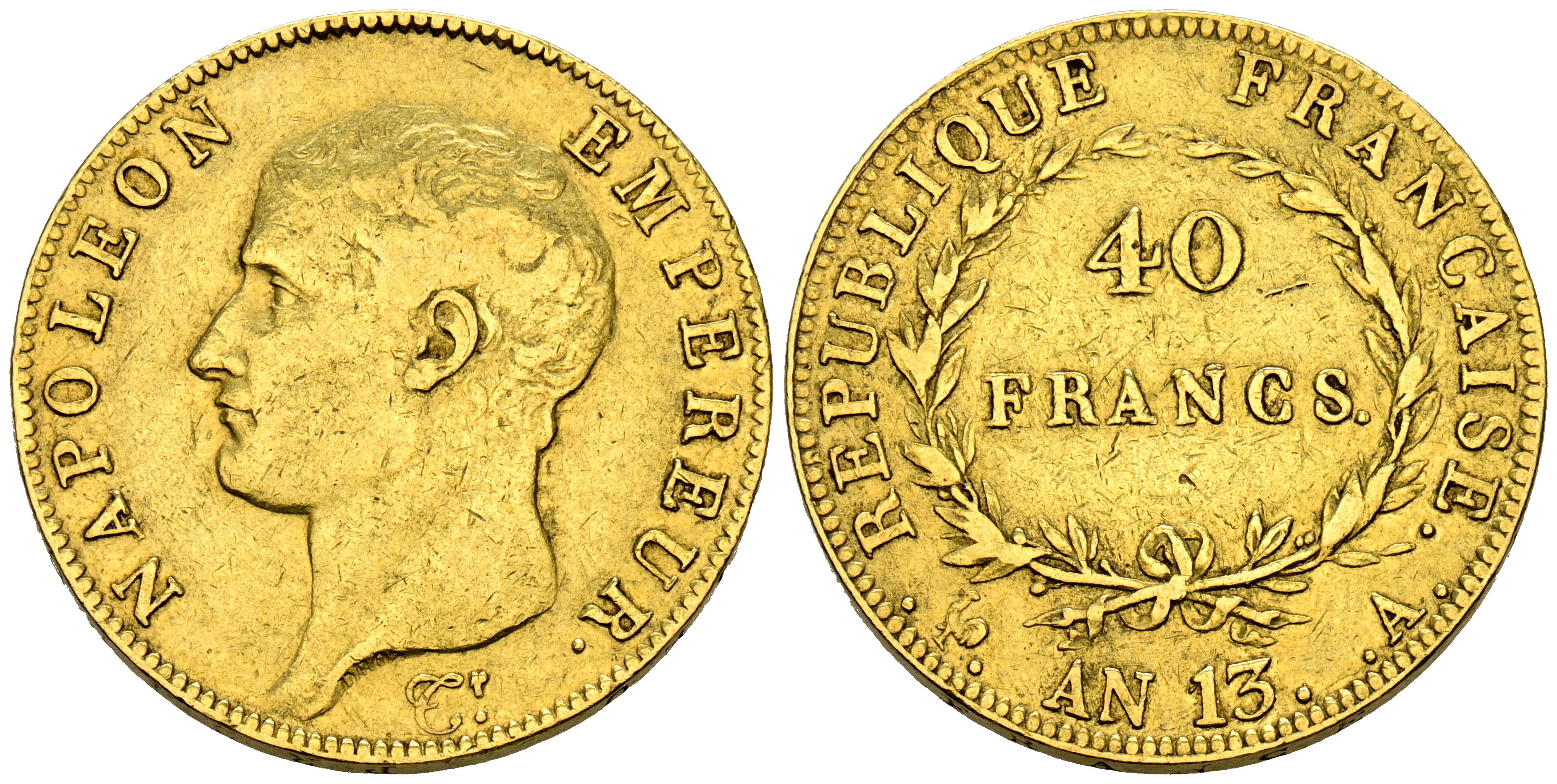 FRANCIA, Napoleón I Emperador. 40 Francos. (Au. 12,86g/26mm). Año 13 (1804-1085). París A. (Km#664.1). MBC.