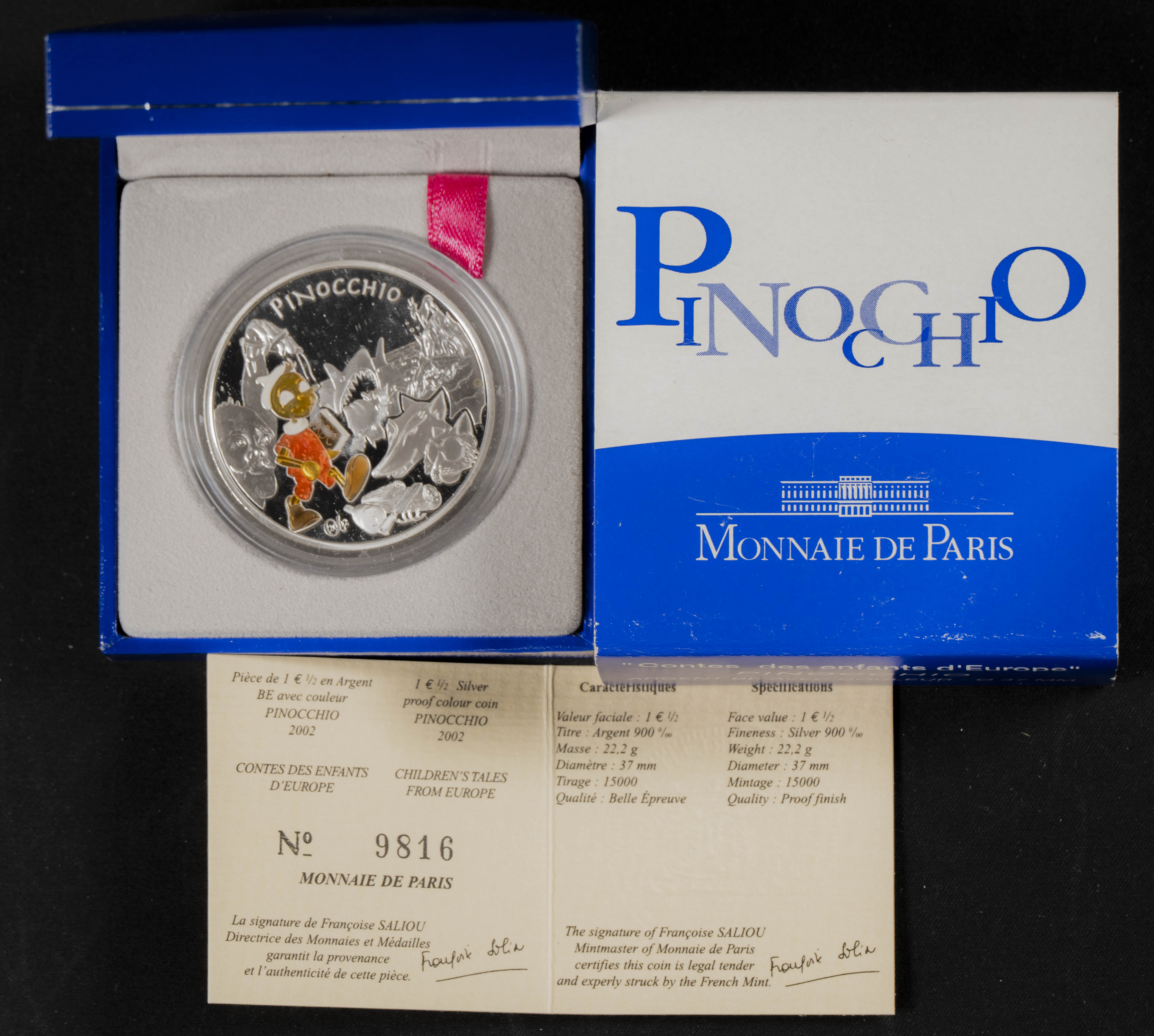 FRANCIA. 1 1/2 Euro. (Ar. 22,20g/37mm). 2002. Monnaie de París. Serie Cuentos Europeos: Pinocho. (Km#1842). PROOF coloreada. Escasa. Incluye estuche y certificado de autenticidad.