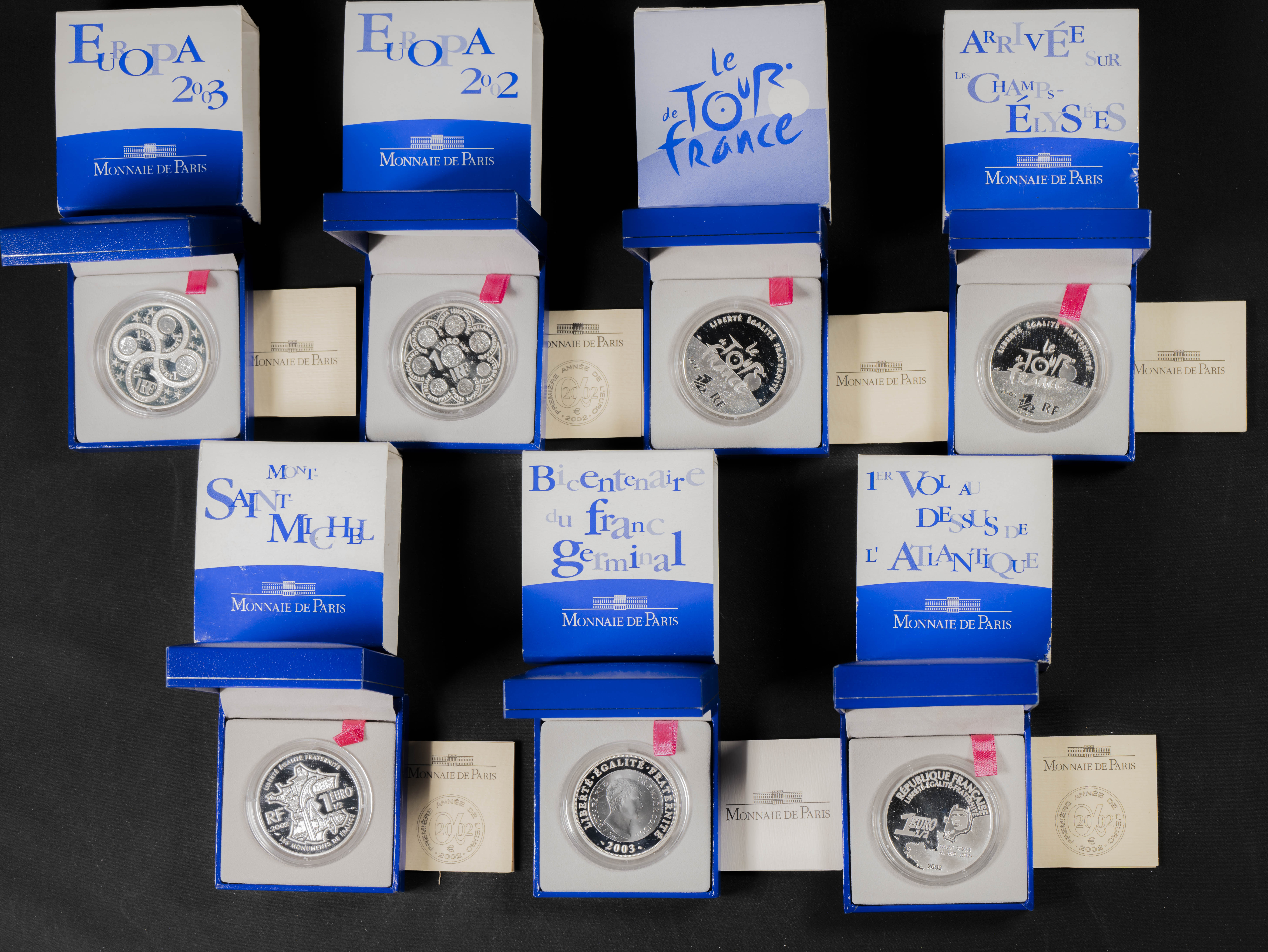 FRANCIA. Interesante y completo conjunto de 15 estuches de 1 1/2 Euro correspondientes a diferentes series: Centenario del Tour de Francia, Monumentos Franceses, Cuentos Infantiles, etc. 2002 y 2003. Monnaie de París. Terminaciones PROOF. Incluye todos los estuches y sus correspondientes certificados de autenticidad. A EXAMINAR.