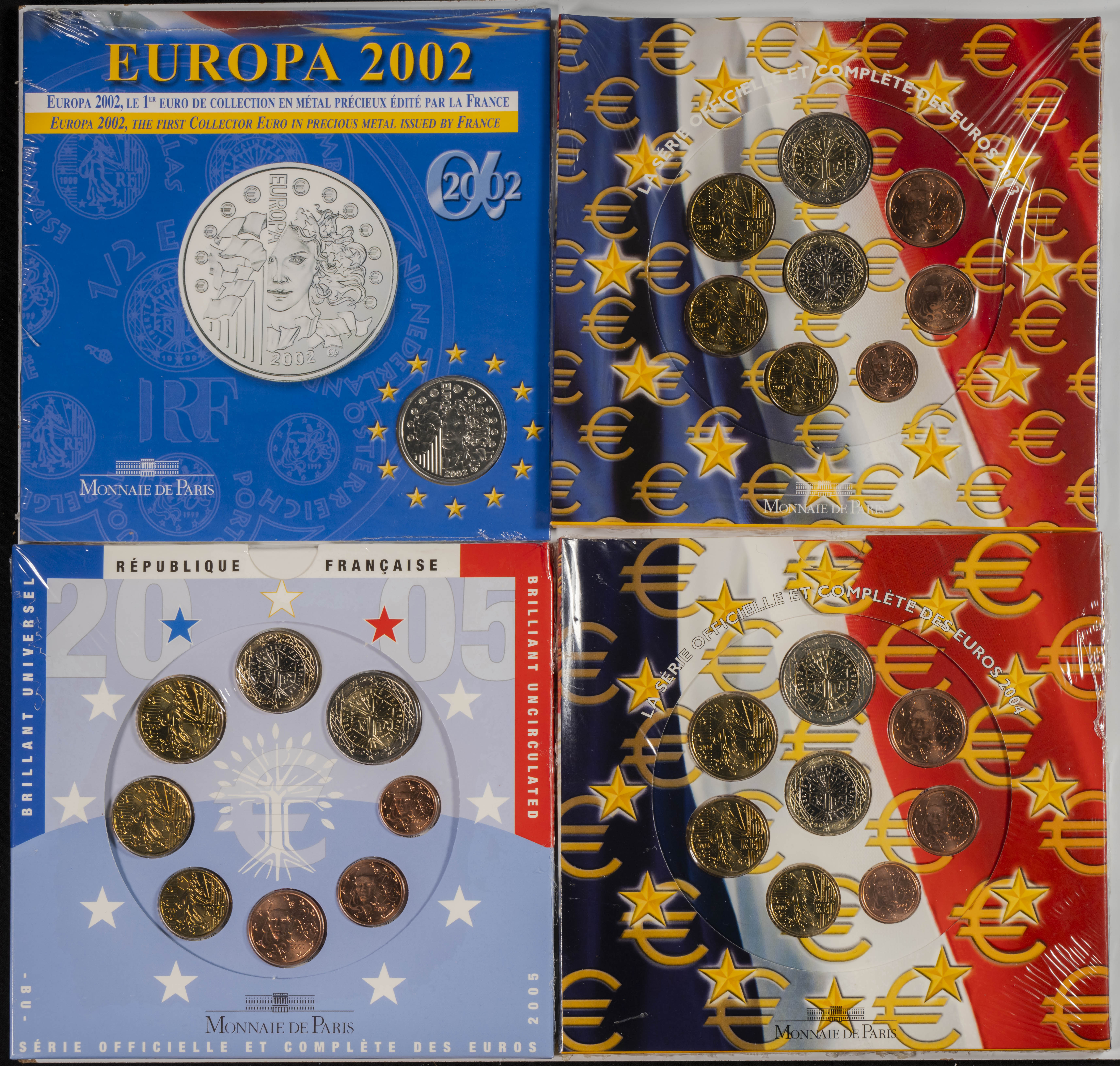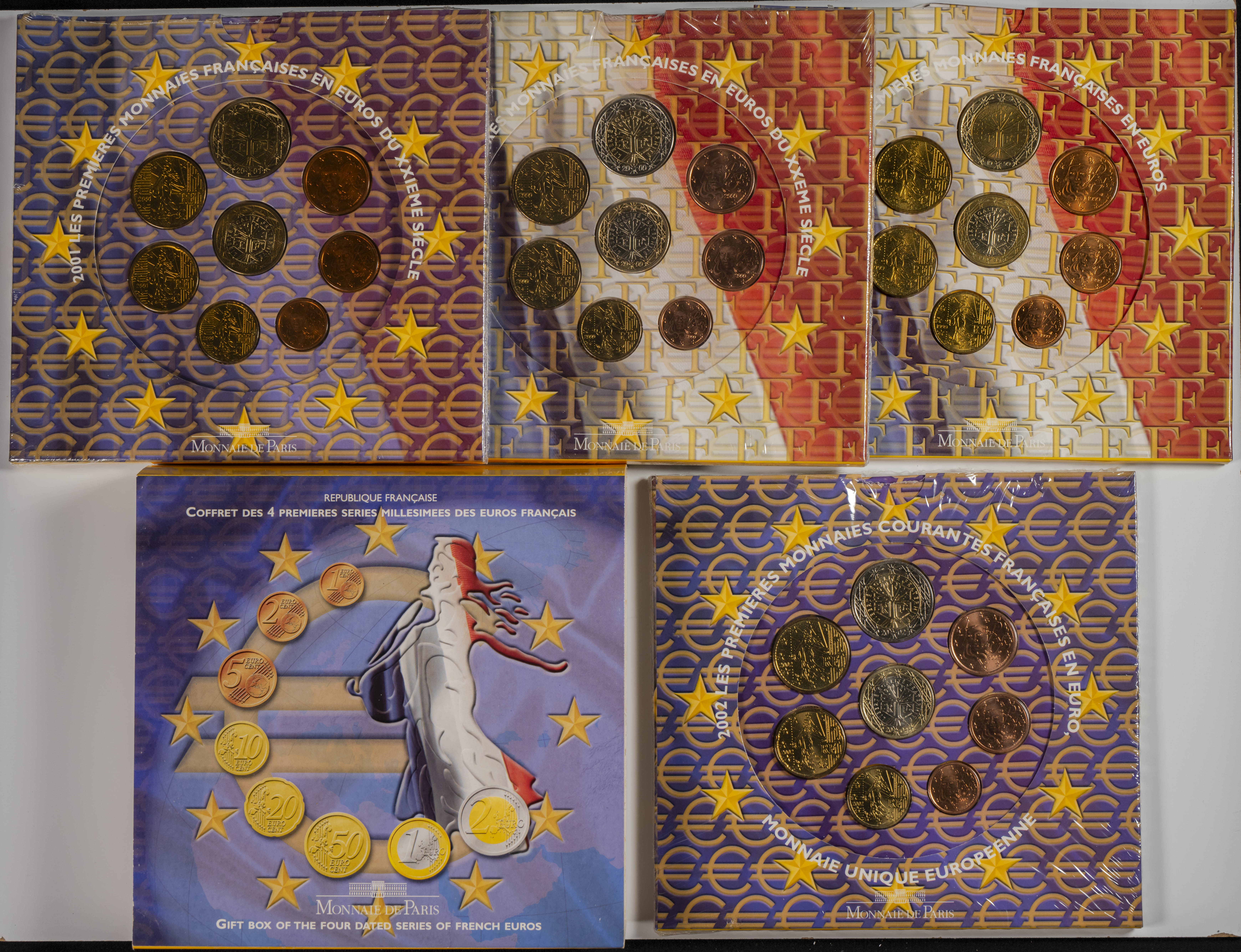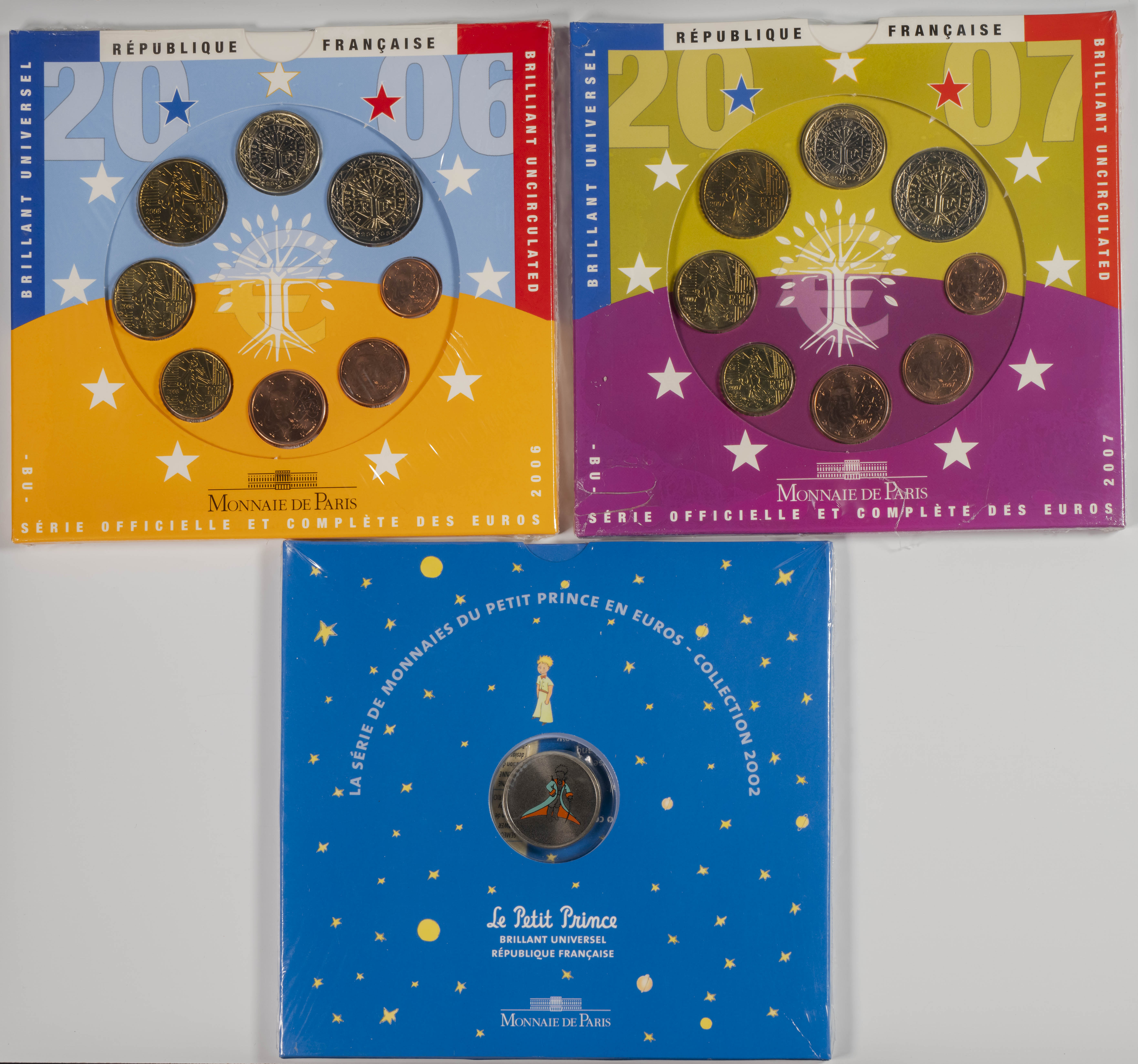FRANCIA. Conjunto de 11 sets completos de series anuales con acuñaciones comprendidas entre 1999 y 2007. Incluye la edición especial de El Principito de Saint Exupéry (2002), caja con las 4 primeras series emitidas y el primer Euro en plata. Ningún set repetido. SC.