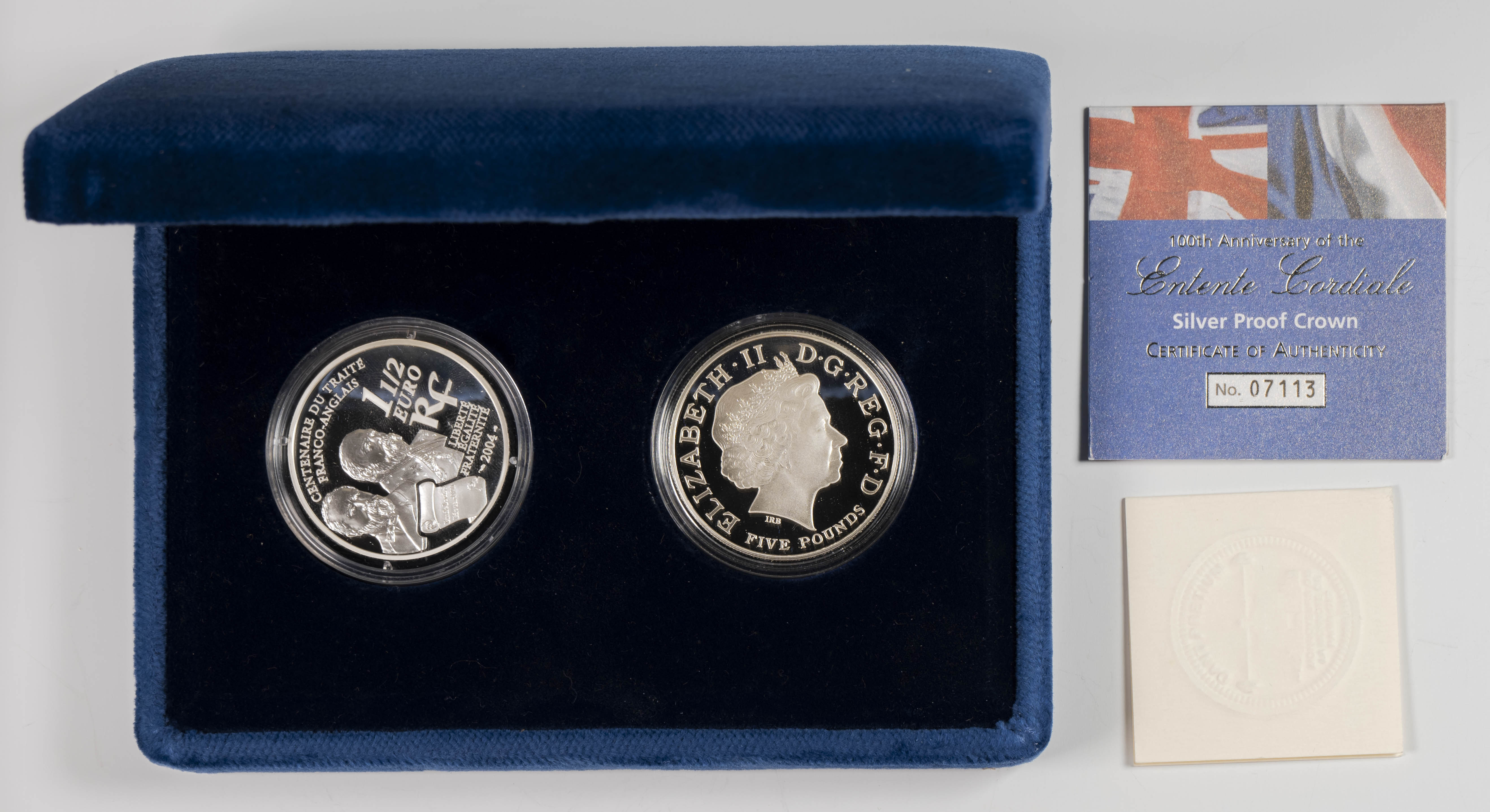 FRANCIA e INGLATERRA. Emisión conjunta y conmemorativa con motivo del centenario de la Entente Cordiale (1904-2004). 2 monedas en plata con valores de 1 1/2 Euro y 5 Libras. Incluye estuche original y certificados de autenticidad. Acabados PROOF.
