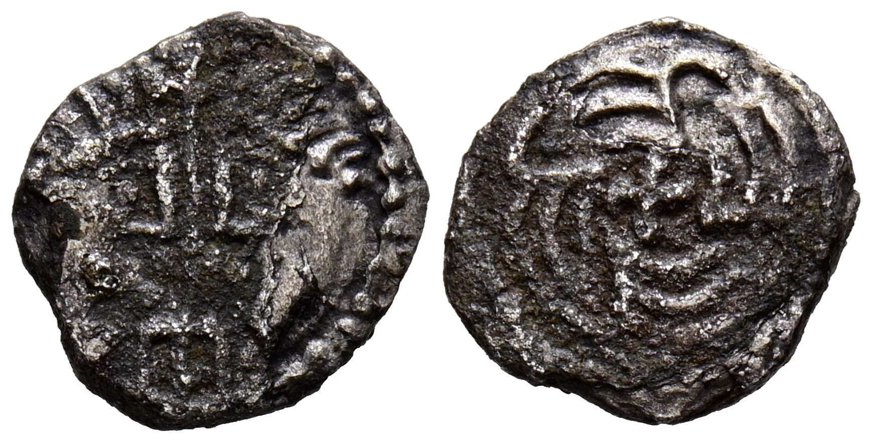 GRAN BRETAÑA, Anglosajón. Sceatta. (Ar. 0,71g/12mm). 710-760 d.C. York. Segunda fase. (S-802A). Anv: Cabezas diademadas enfrentadas , entre ellos crucifijo. Rev: Cuatro pájaros en el sentido de las agujas del reloj alrededor de una cruz. MBC-. Escasa.