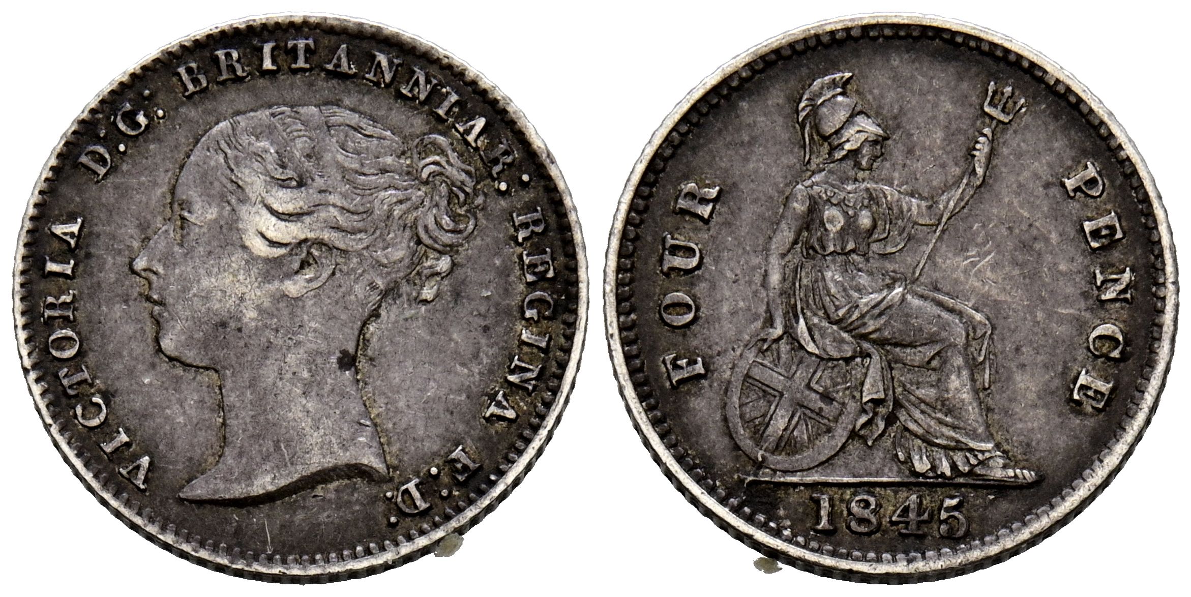 GRAN BRETAÑA, Victoria. 4 Pence. (Ar. 1,88g/16mm). 1845. (Km#731.1). Moneda para circular en la Guayana británica. MBC. Bonito tono.