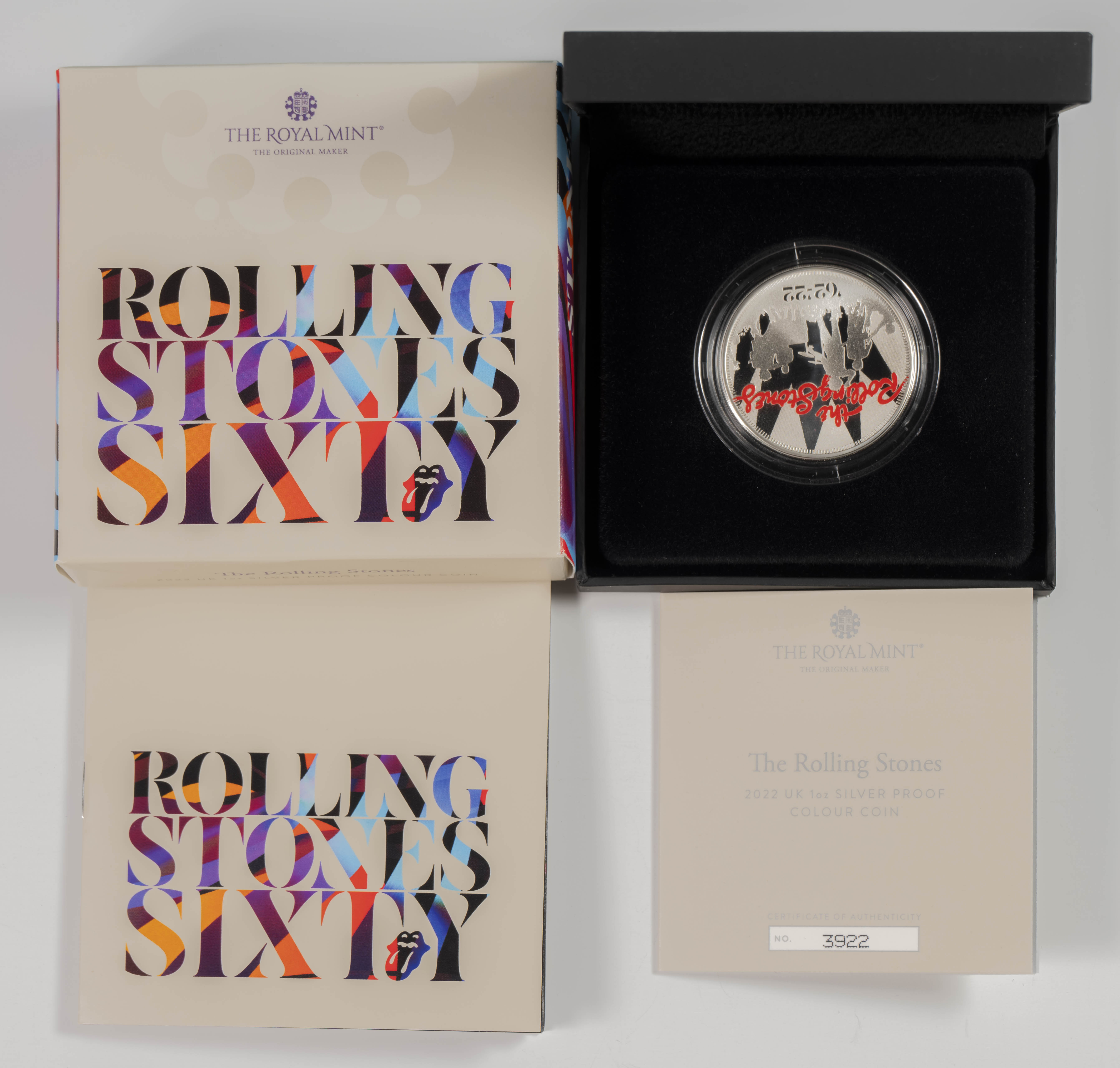REINO UNIDO. 2 Libras. (Ar. 31,21g/39mm). 2022. Royal Mint. The Rolling Stones. 60 Aniversario. Leyendas de la Música. PROOF. Coloreada. Incluye estuche oficial y certificado de autenticidad. Edición limitada de sólo 8.000 unidades.