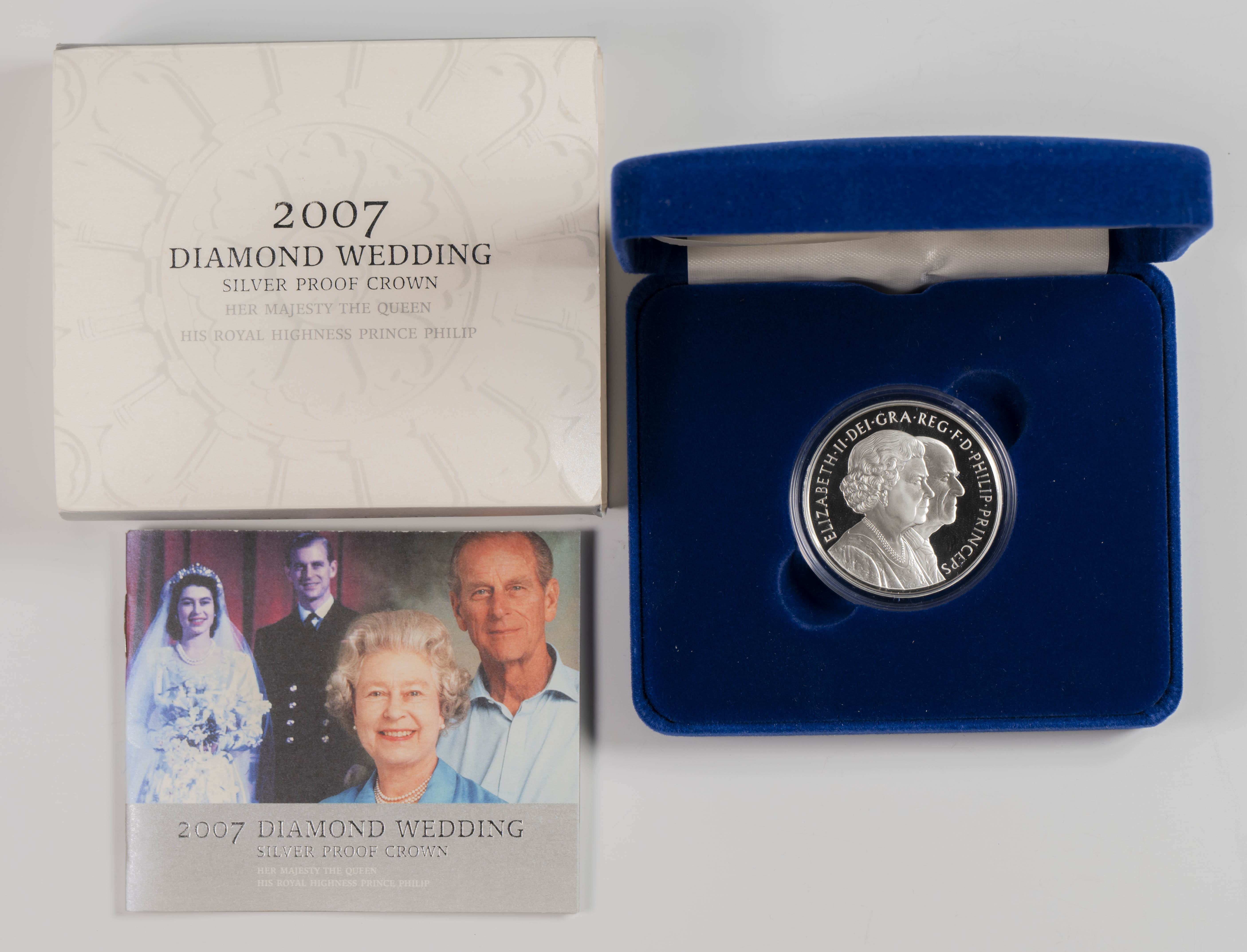 GRAN BRETAÑA. 5 Pounds. (Ar. 28,28g/39mm). 2007. Bodas de Diamante de la Reina Isabel II y el Príncipe Philip. PROOF. Incluye estuche original y certificado de autenticidad.