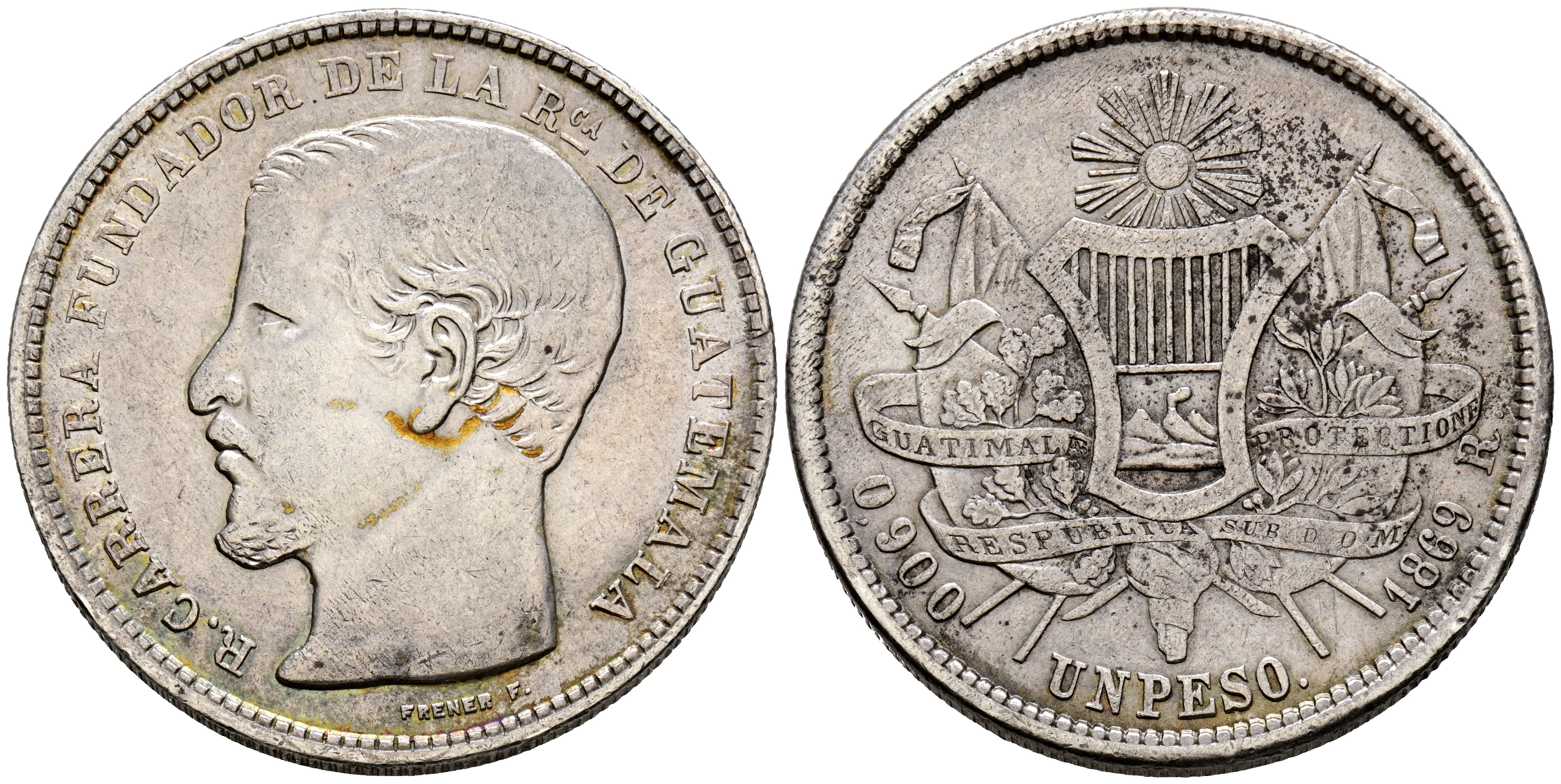 GUATEMALA. 1 Peso. (Ar. 24,90g/32mm). 1869. Rafael Cabrera. (Km#186). MBC. Buen ejemplar.