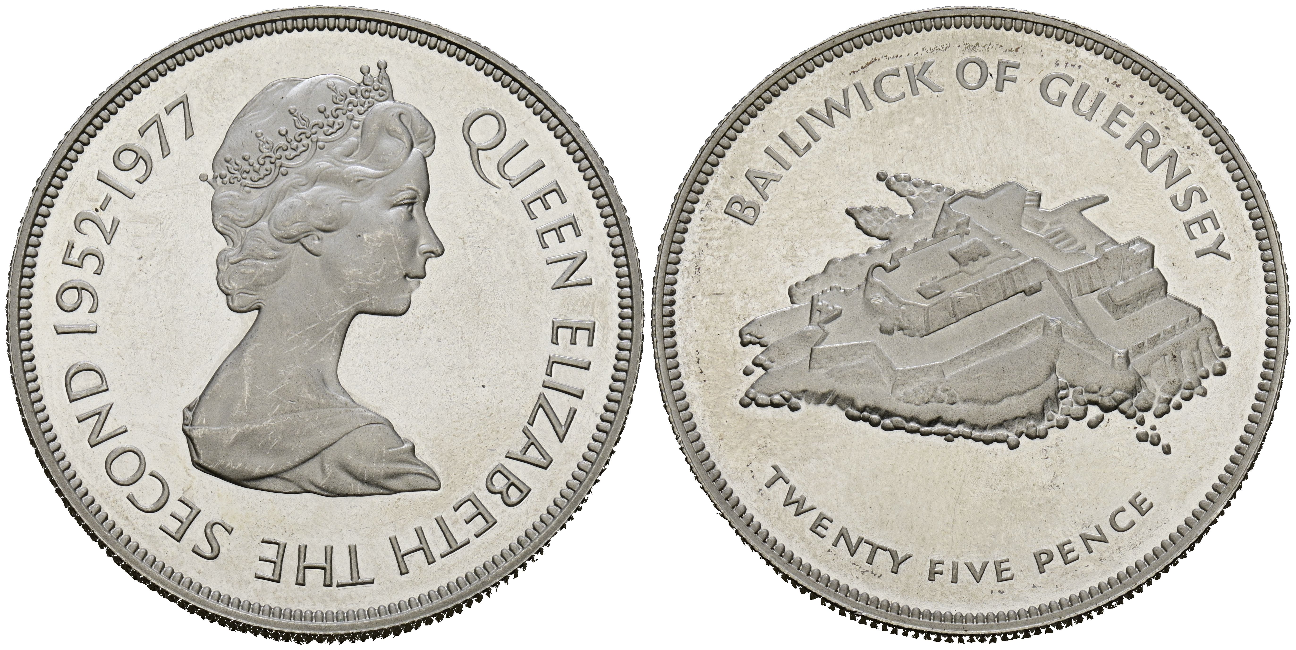 GUERNSEY. 25 Pence. (Ar. 28,29g/39mm). 1980. 25 Aniversario del reinado de Isabel II. (Km#31a). PROOF. Leves rayitas.