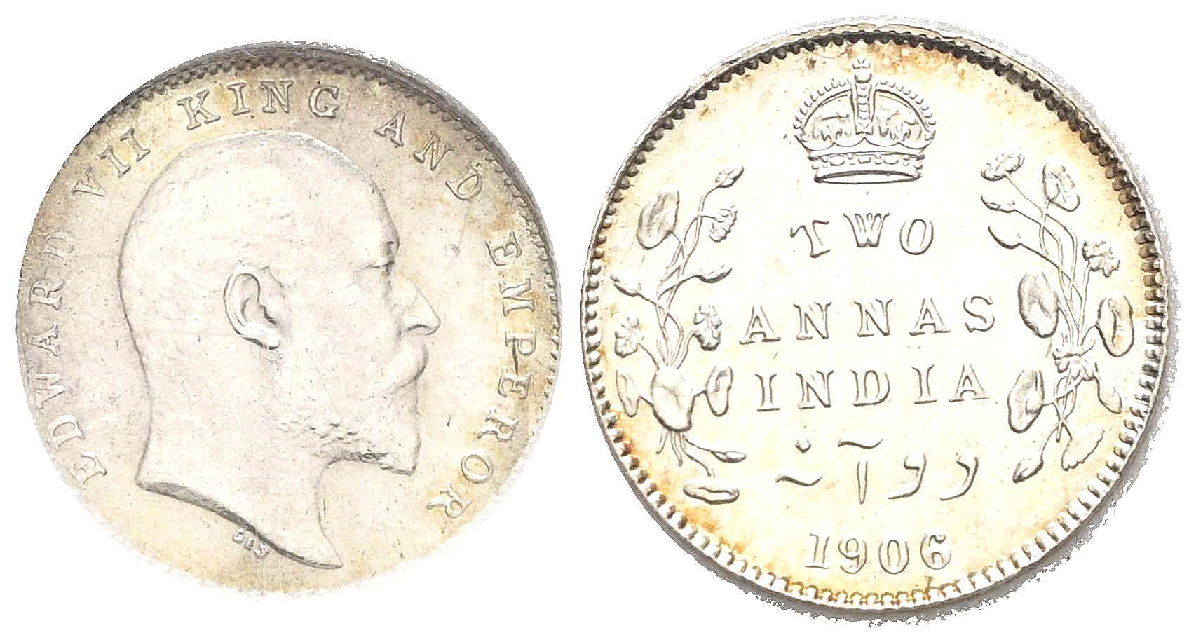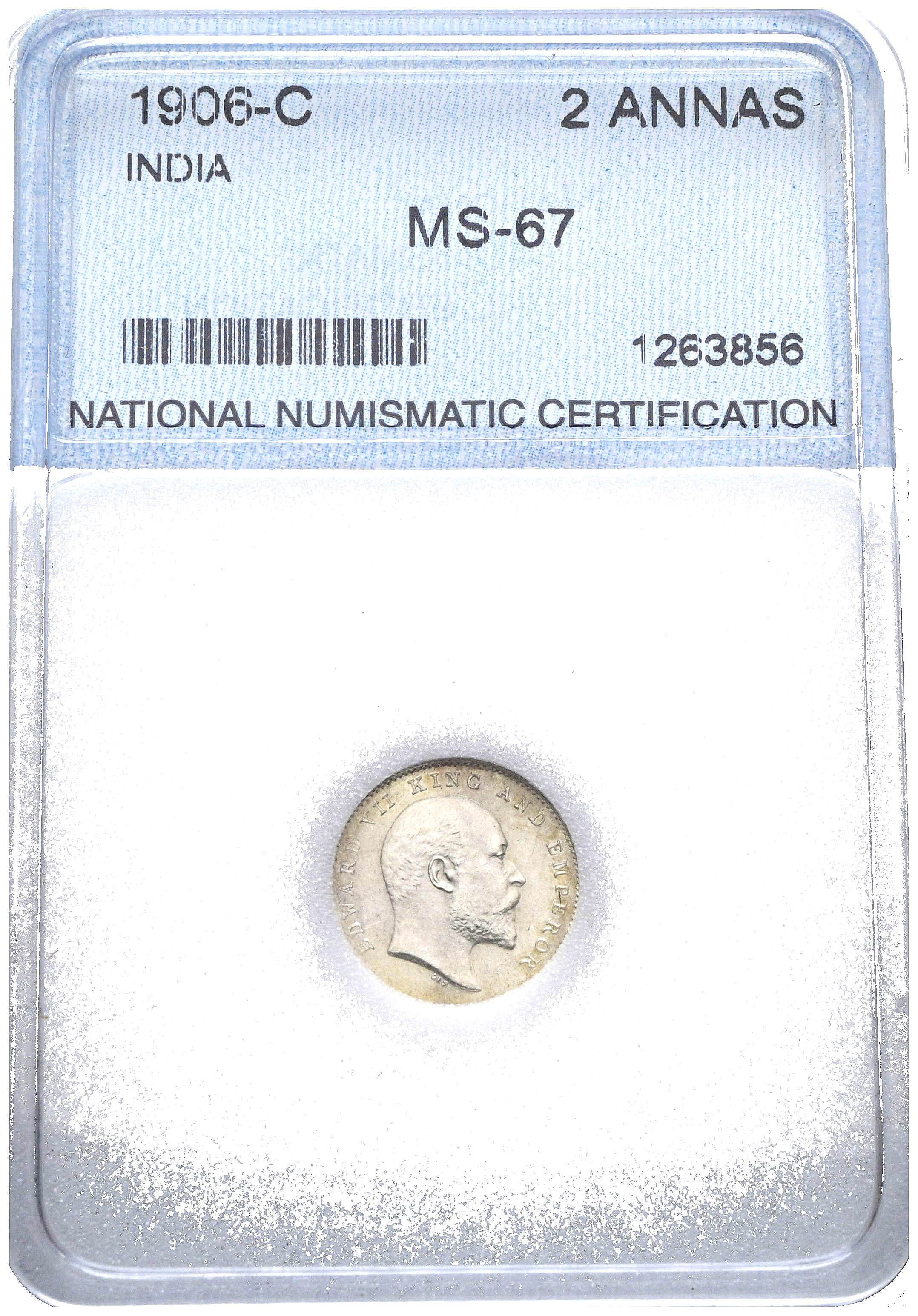 INDIA (Británica). 2 Annas. (Ar. 1,46g/15mm)*. 1906. Calculta C. (Km#505). Encapsulada por NNC MS67. *Peso y mdidas teóricos.