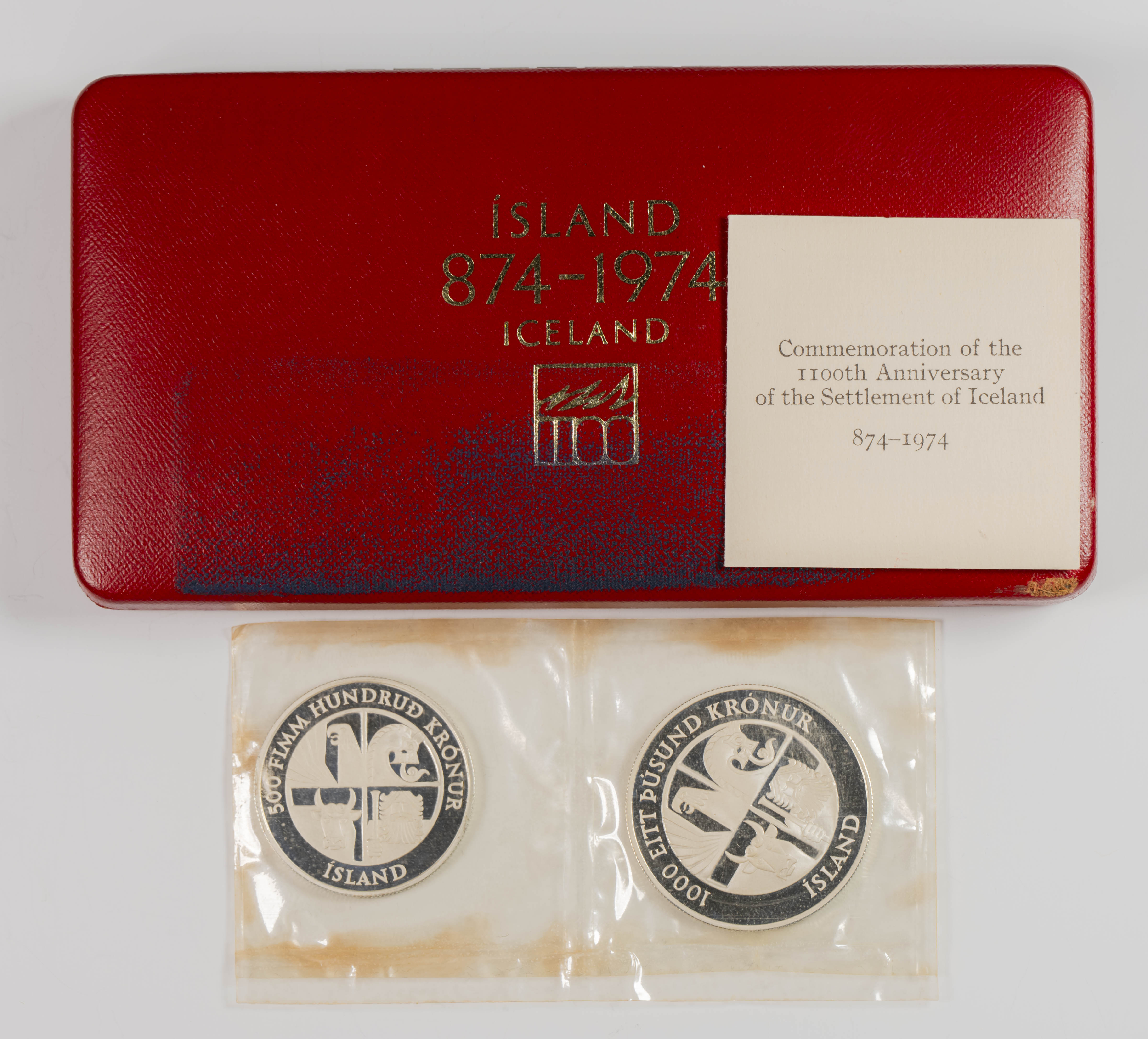 ISLANDIA. Estuche conmemorativo del 1100 Aniversario del Primer Asentamiento de la Isla. Está compuesto por 2 monedas en plata (aún en blíster) con valores de 500 y 1000 Coronas. 1974. Calidades PROOF. Incluye estuche original (con mancha azul) y certificado de autenticidad.