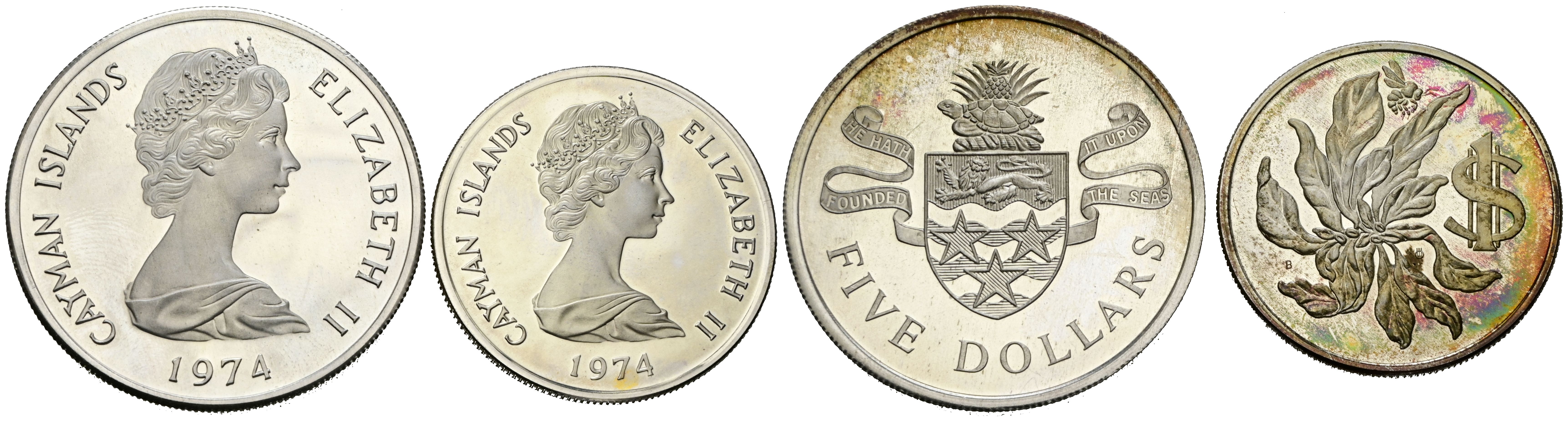 ISLAS CAIMÁN. Pareja de 1 y 5 Dollars en plata acuñados en 1974. (Km#6-8). PROOF.