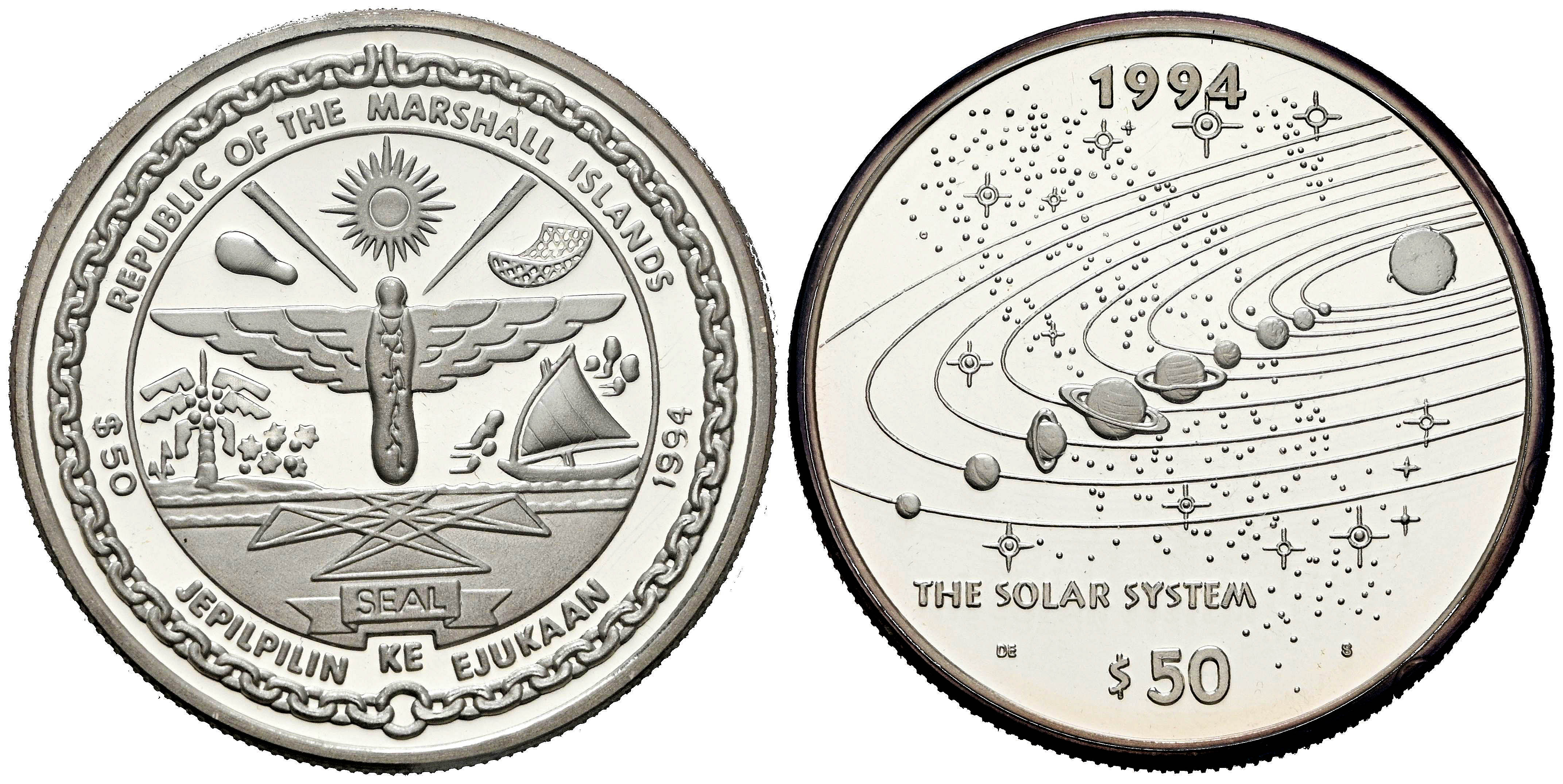 ISLAS MARSHALL. 50 Dollars. (Ar. 31,14g/39mm). 1994. Maravillas del Sistema Solar: Sistema Solar (Km#178). PROOF. Onza de plata pura. Incluye cápsula.