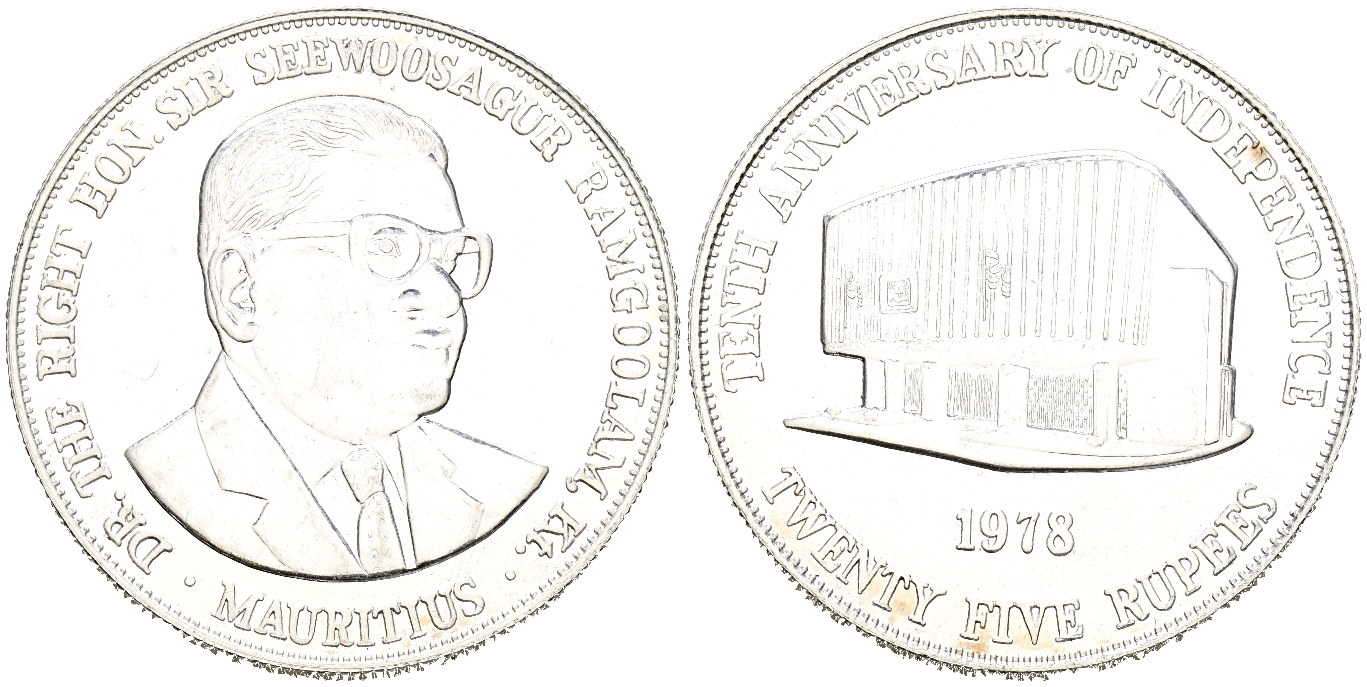ISLAS MAURICIO. 25 Rupias. (Ar. 27,10g/39mm). 1978. Décimo Aniversario de la Independencia. (Km#44). EBC. Ligeras rayitas.
