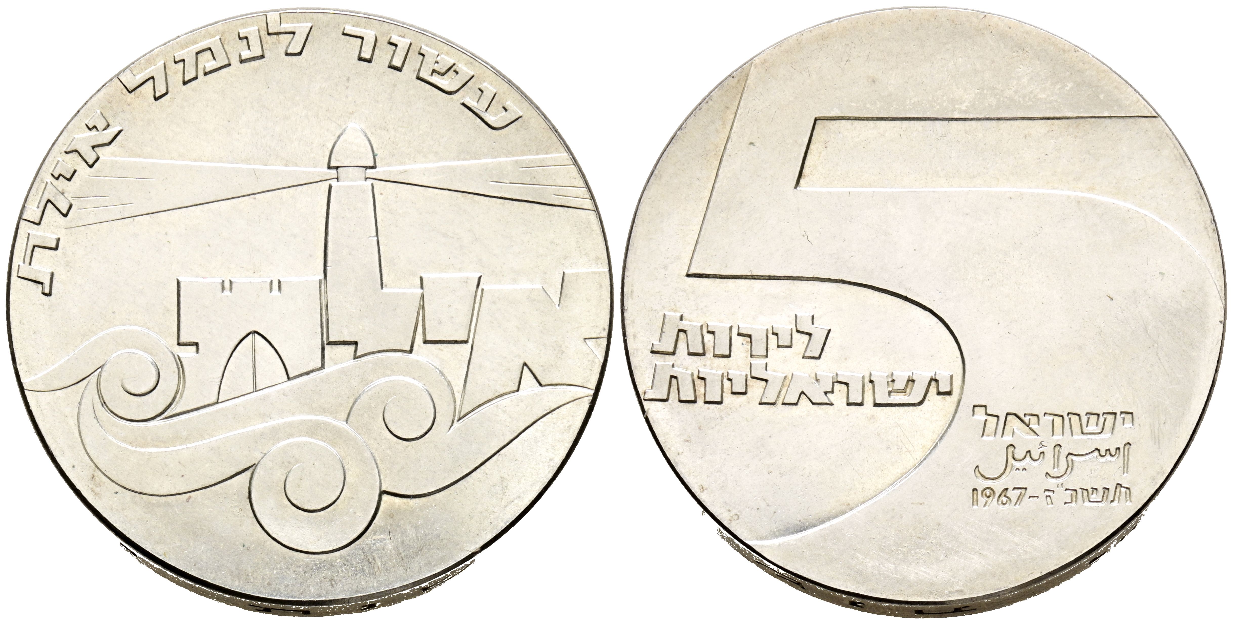 ISRAEL. 5 Lirot. (Ar. 25,07g/34mm). 1967. 19 Aniversario de la Independencia. Puerto de Eilat. (Km#48). EBC.