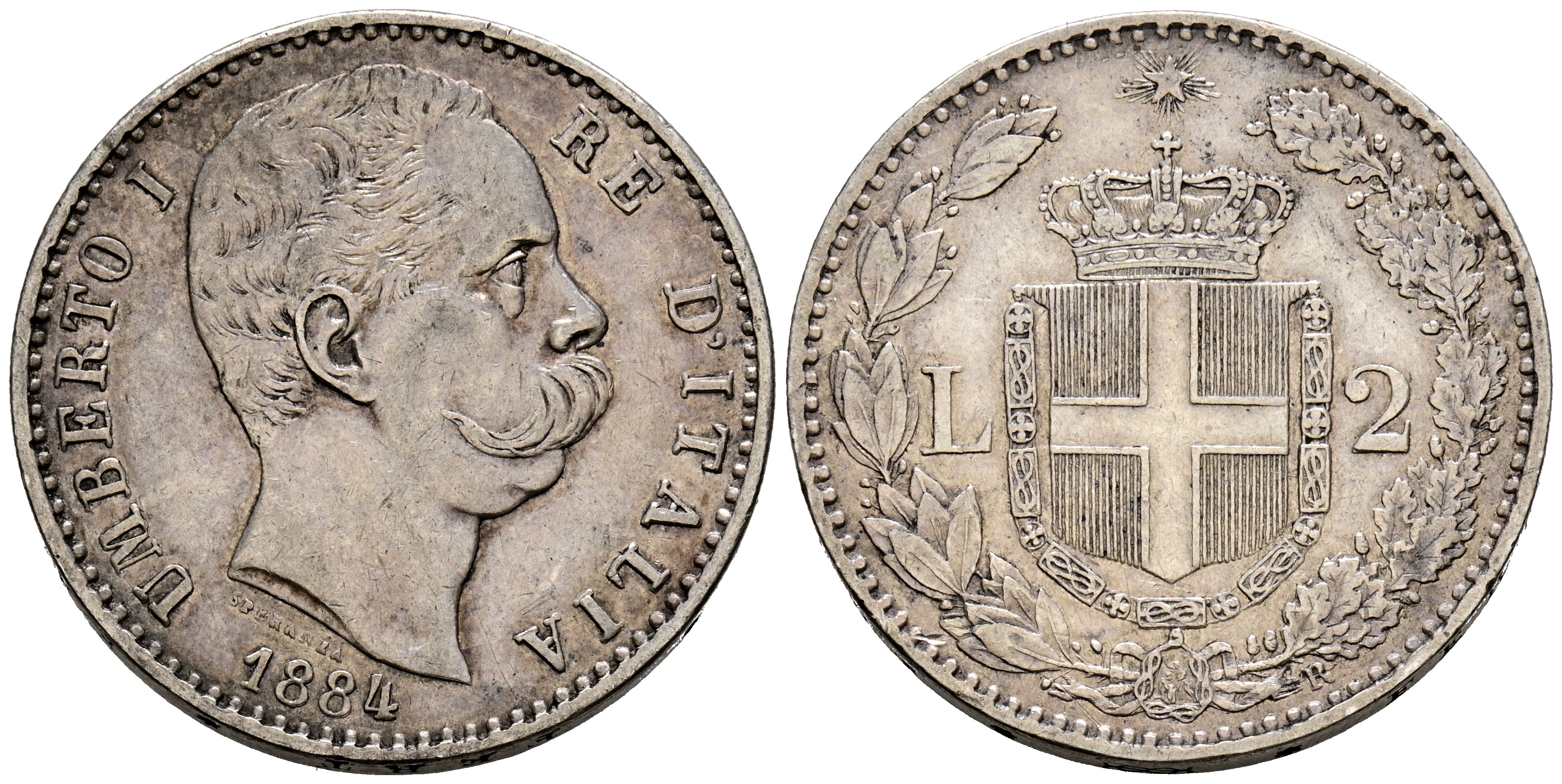 ITALIA, Umberto I. 2 Liras. (Ar. 9,98g/27mm). 1884. (Km#23). MBC+.