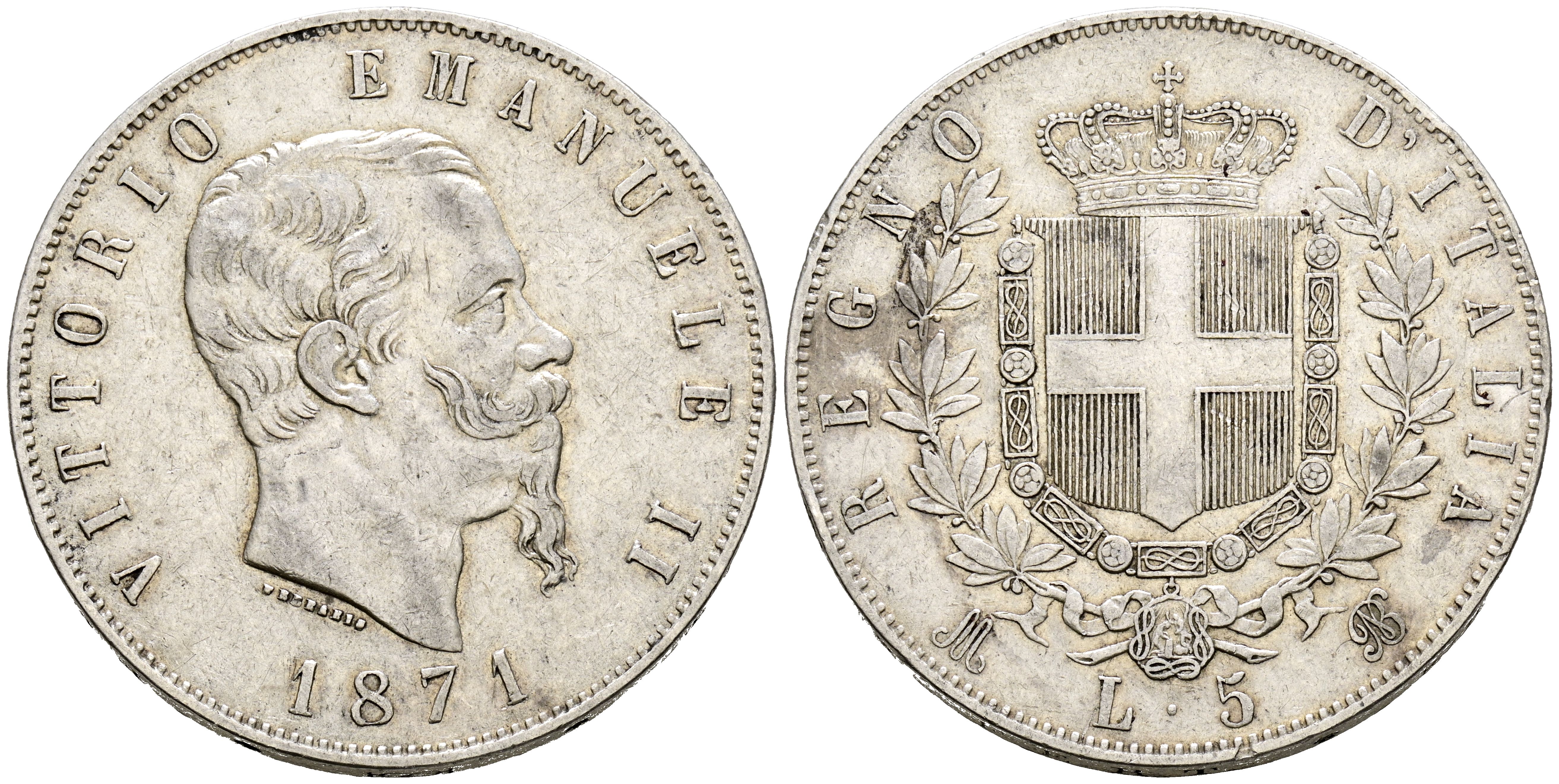 ITALIA, Victor Manuel II. 5 Liras. (Ar. 24,82g/37mm). 1871. Milán. (Km#8.3). MBC.