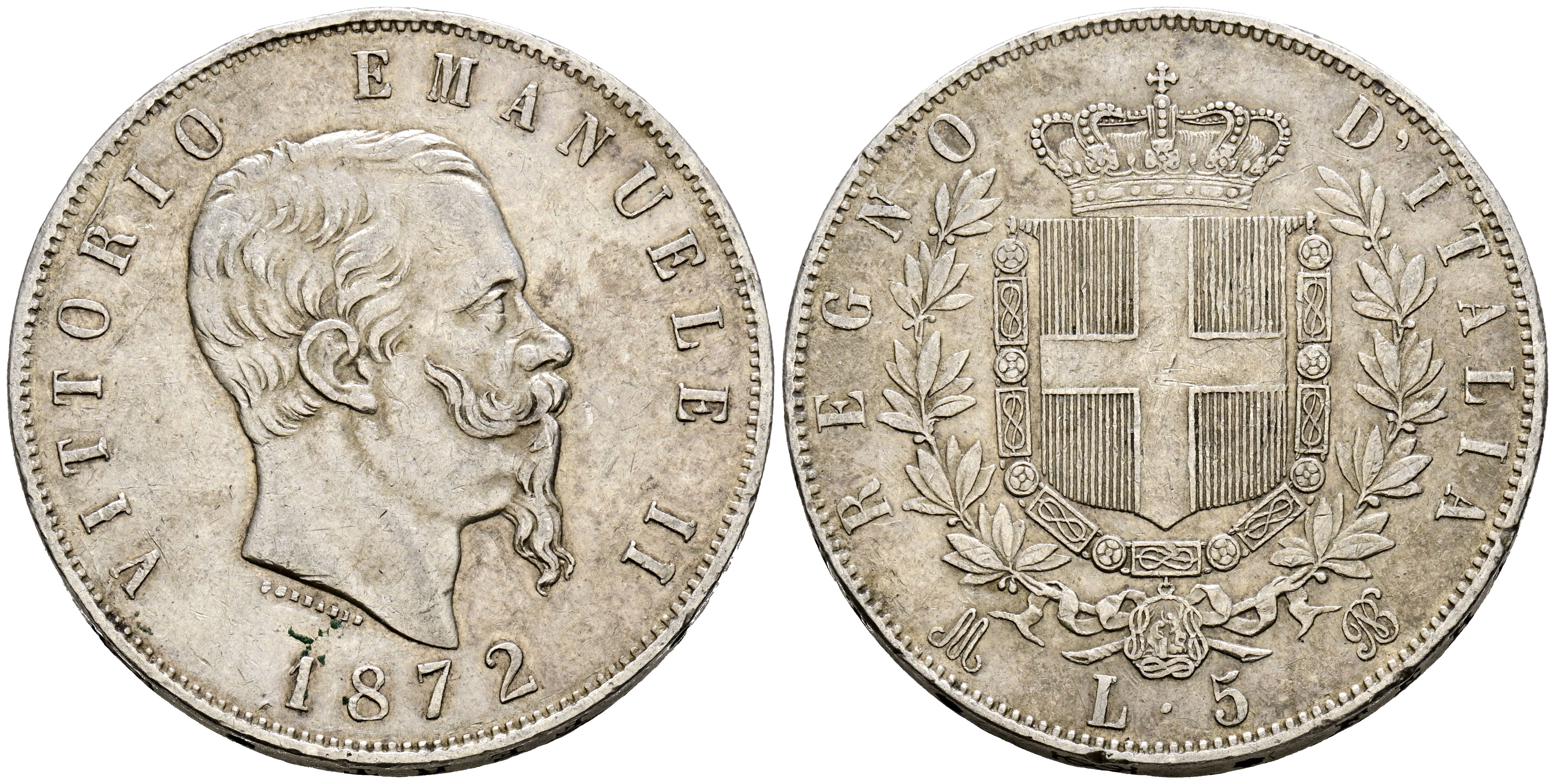 ITALIA, Victor Manuel II. 5 Liras. (Ar. 25,04g/37mm). 1872. Milán. (Km#8.3). MBC.