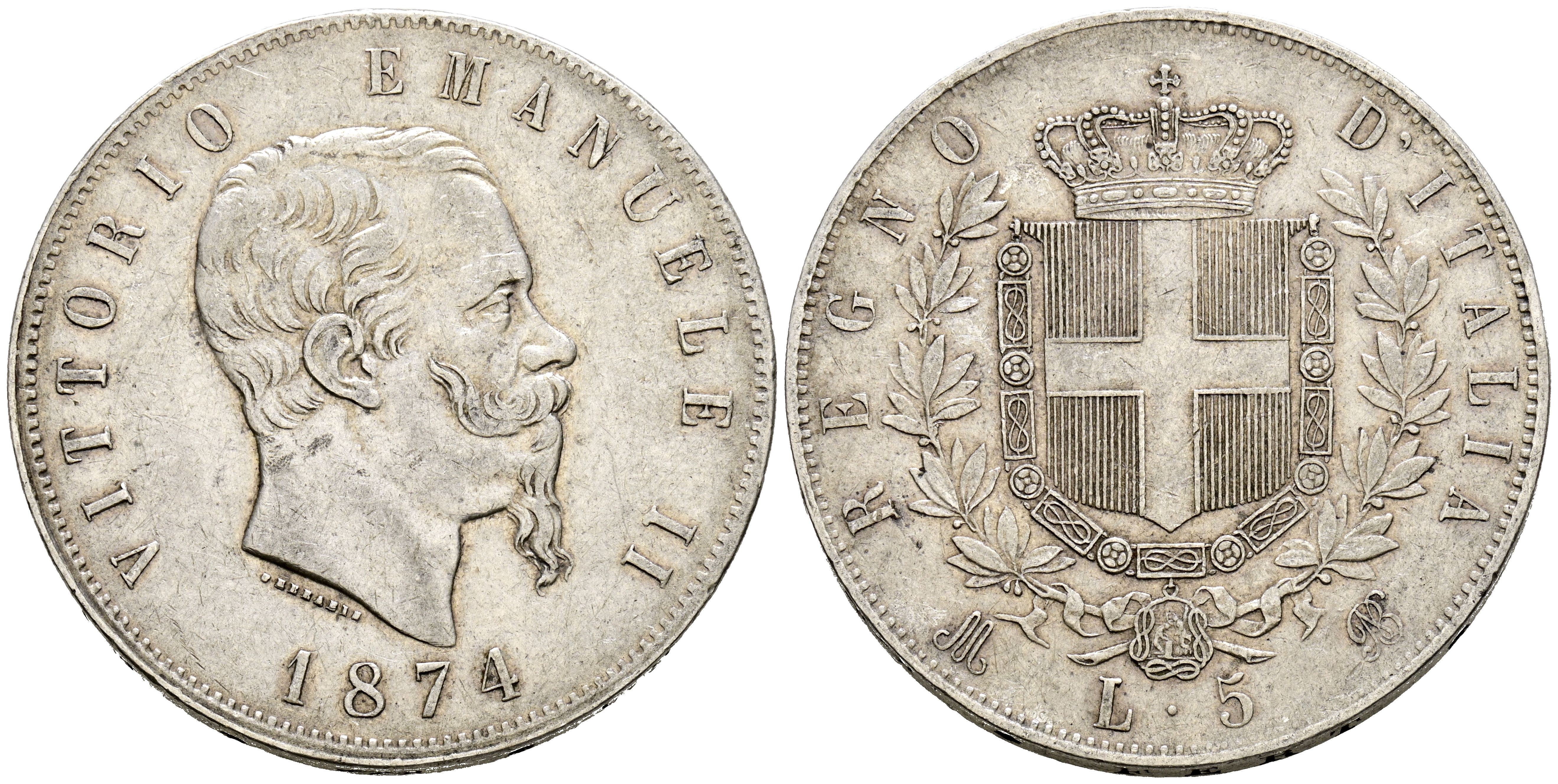 ITALIA, Victor Manuel II. 5 Liras. (Ar. 24,72g/37mm). 1874. Milán. (Km#8.3). MBC.