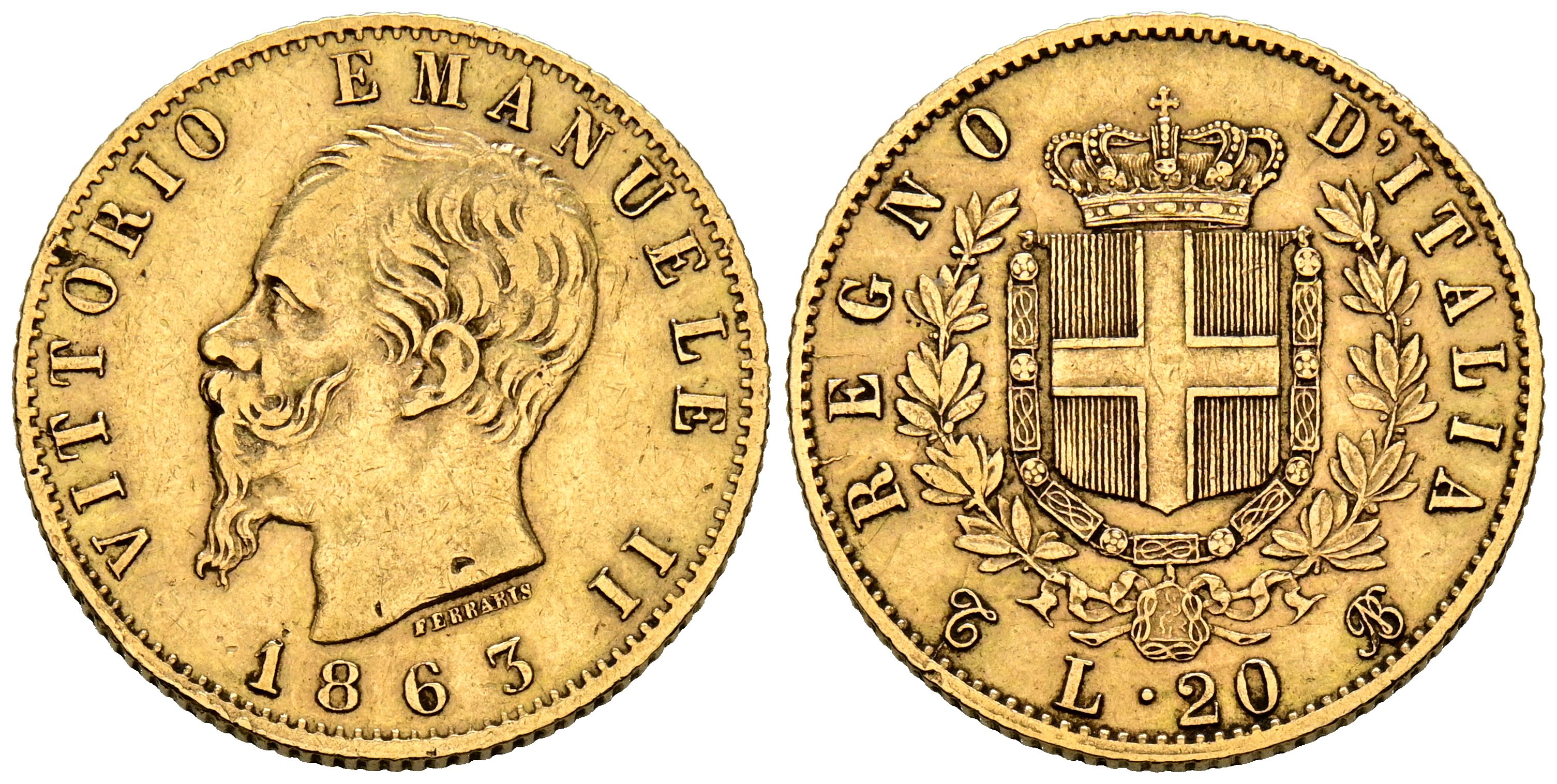 ITALIA, Victor Manuel II. 20 Liras. (Au. 6,45g/21mm). 1863. Turín. (Km#10.1). MBC.