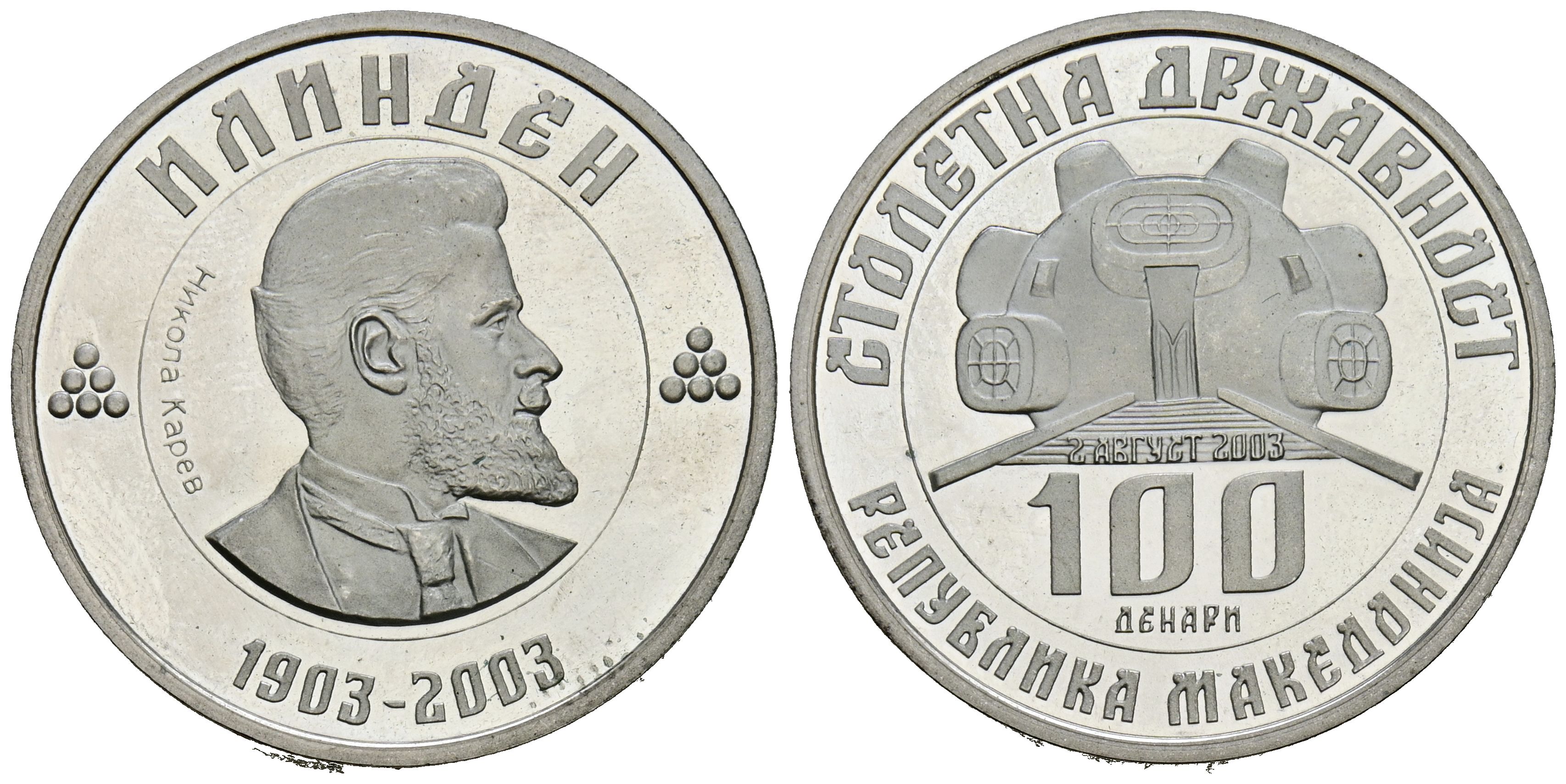 MACEDONIA, Nicola Karev. 100 Denari. (Ar. 6,96g/24mm). 2003. (Km#19). PROOF. Muy escasa. Sólo 500 unidades acuñadas.