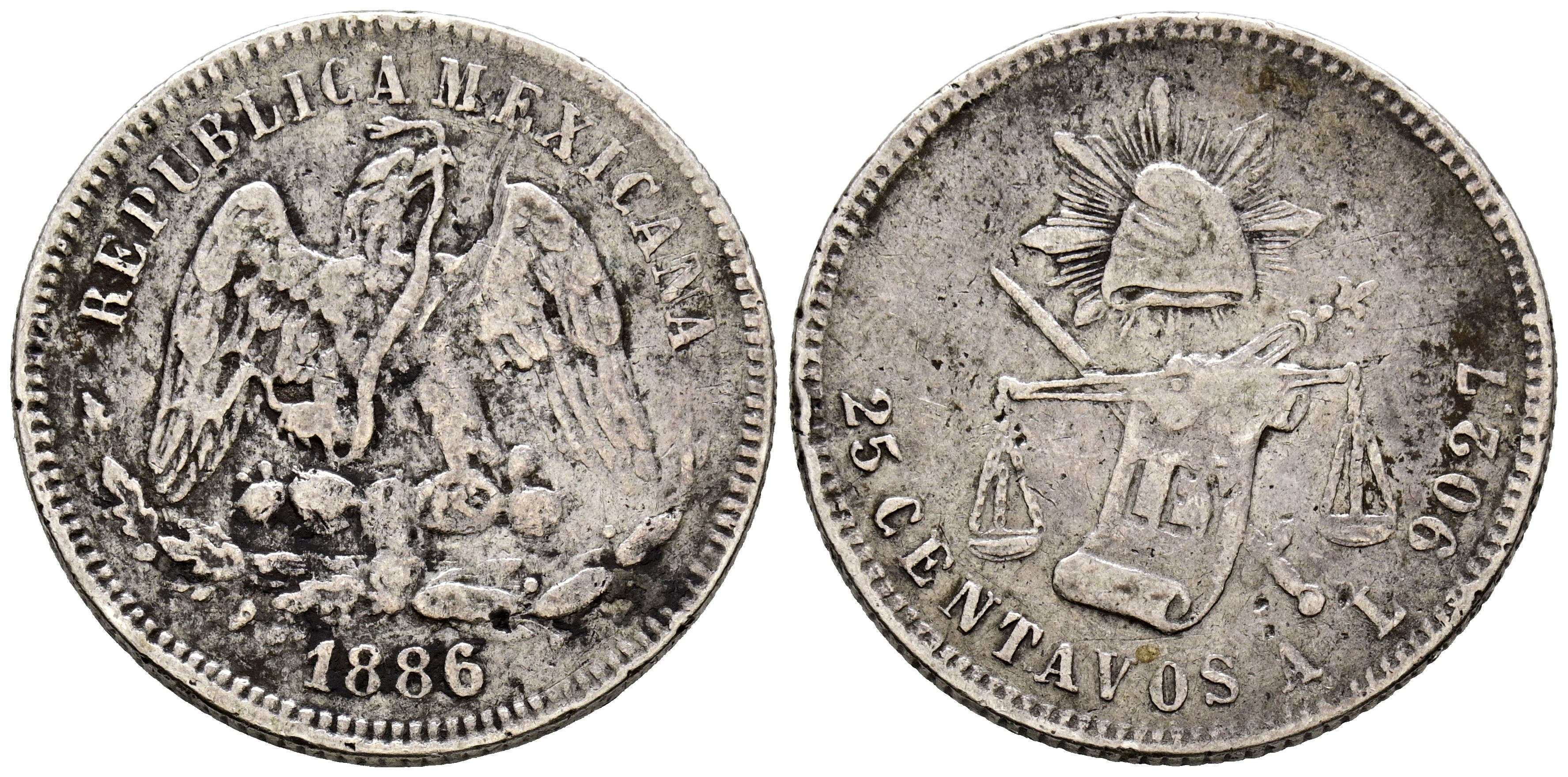 MÉXICO. 25 Centavos. (Ar. 6,80g/25mm). 1886. Álamos L. (Km#406). MBC-. Rara.