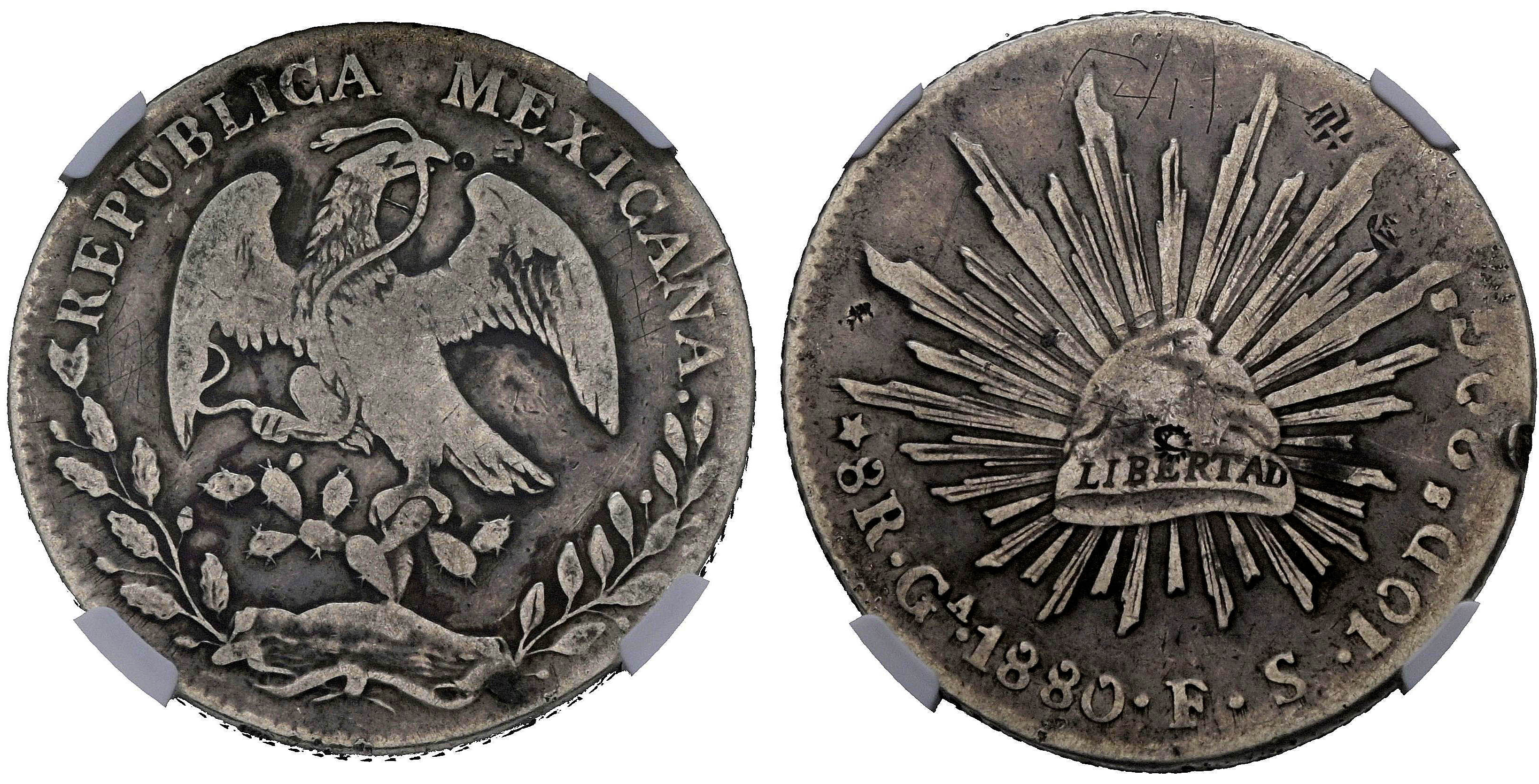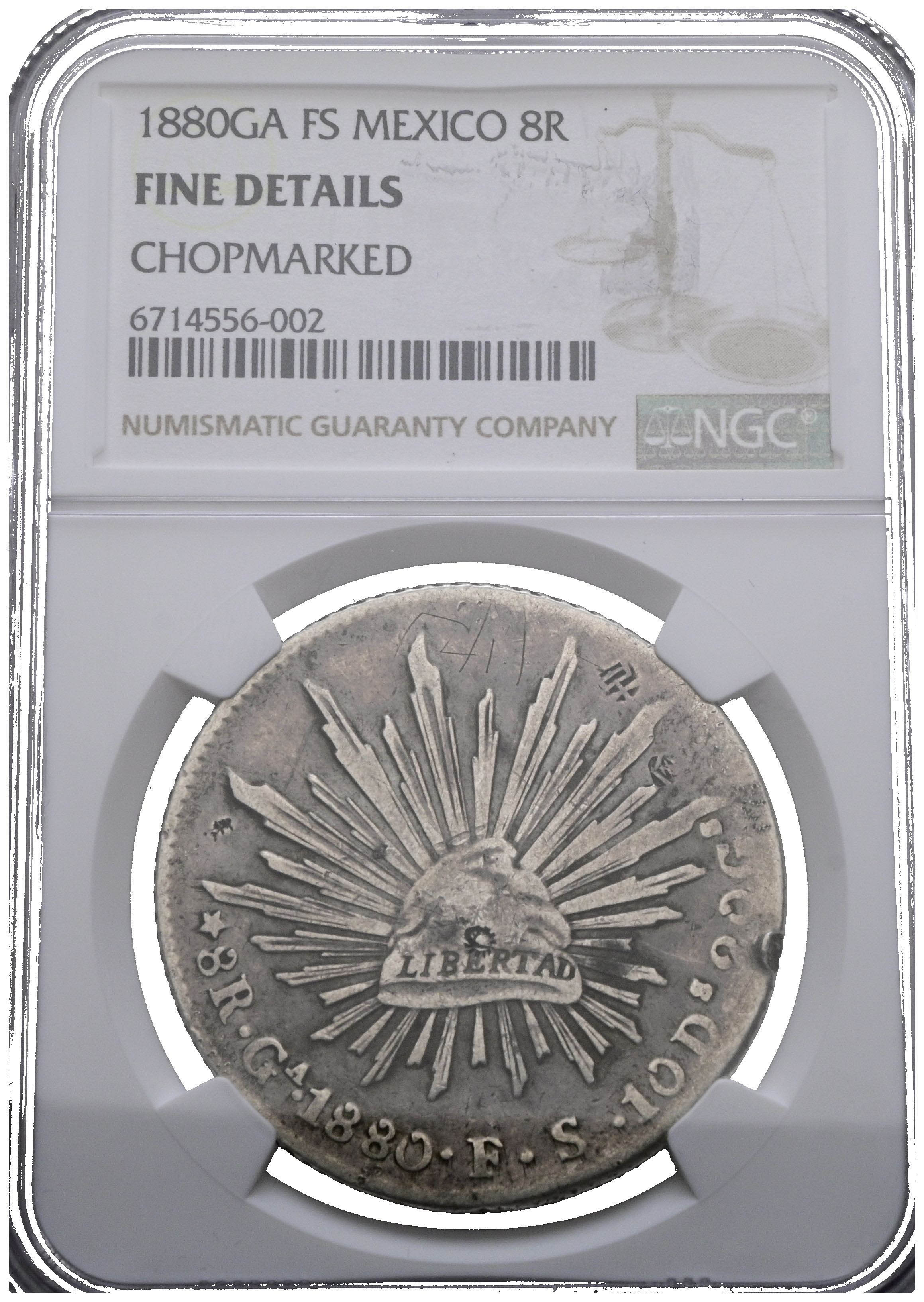 MÉXICO. 8 Reales. (Ar. 27,07g/39mm)*. 1880. Guadalajara FS. (Km#377.6). Encapsulado por NGC Fine Details, Chopmarked. *Peso y medidas teóricos.