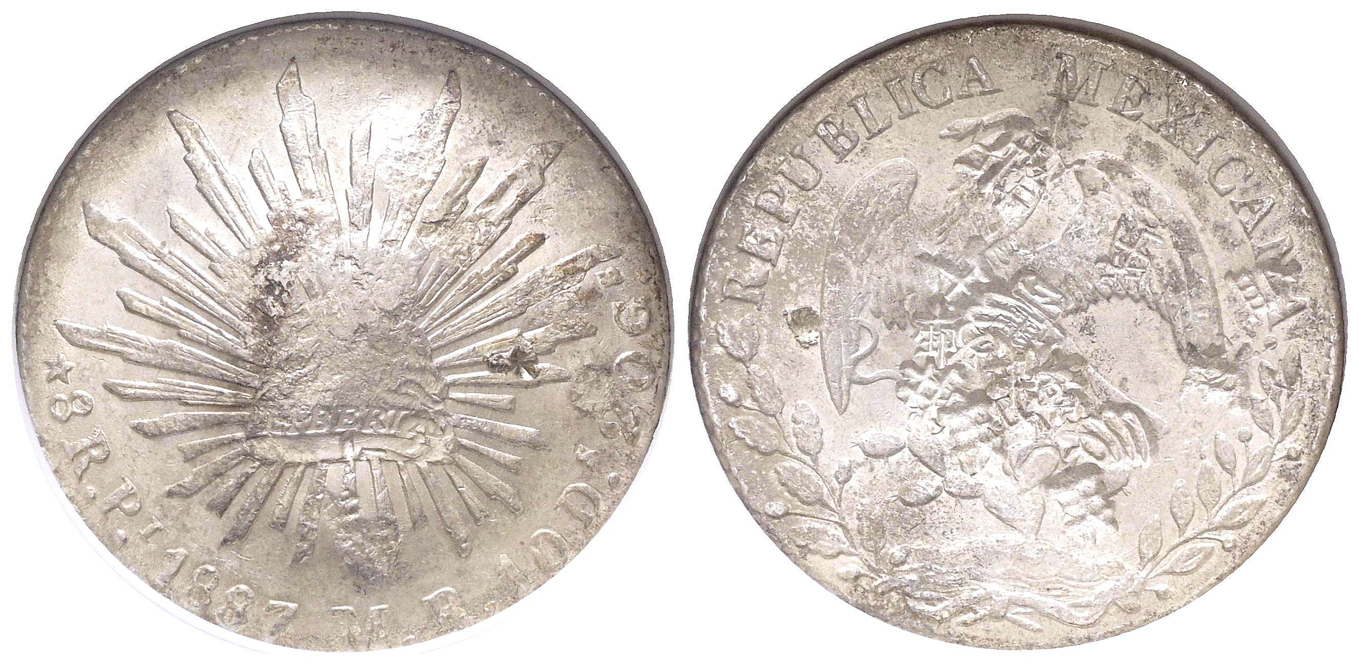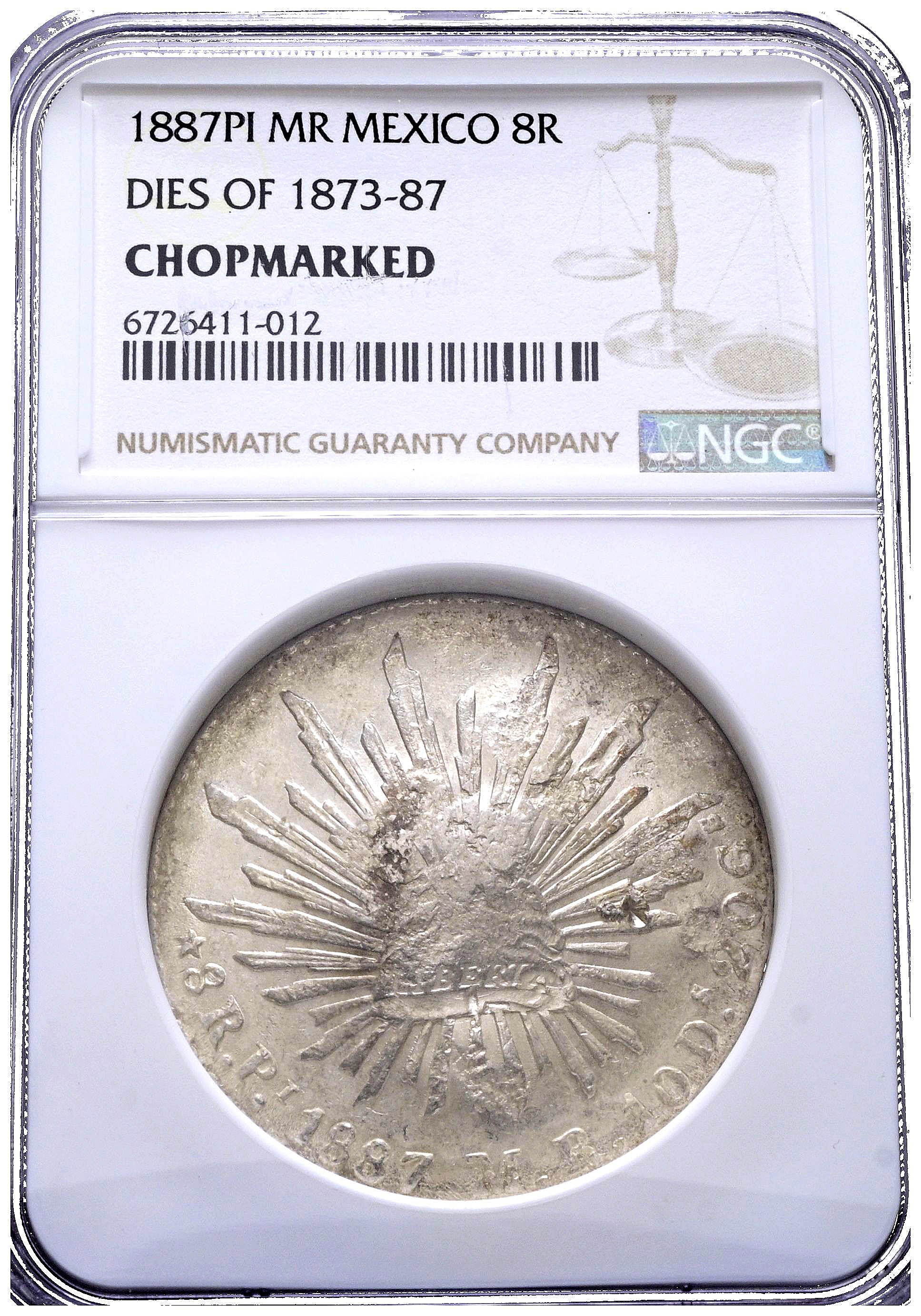 MÉXICO. 8 Reales. (Ar. 27,00g/39mm)*. 1887. San Luis de Potosí MR. (Km#377.12). Encapsulado por NGC. Chopmarked. (Dies of 1873-1887). *Peso y medidas teóricos.