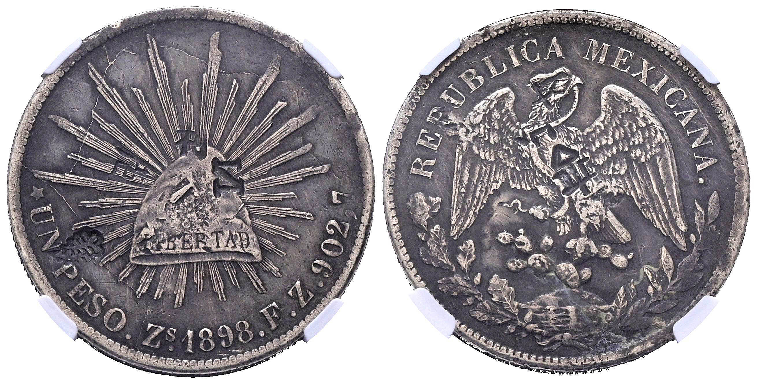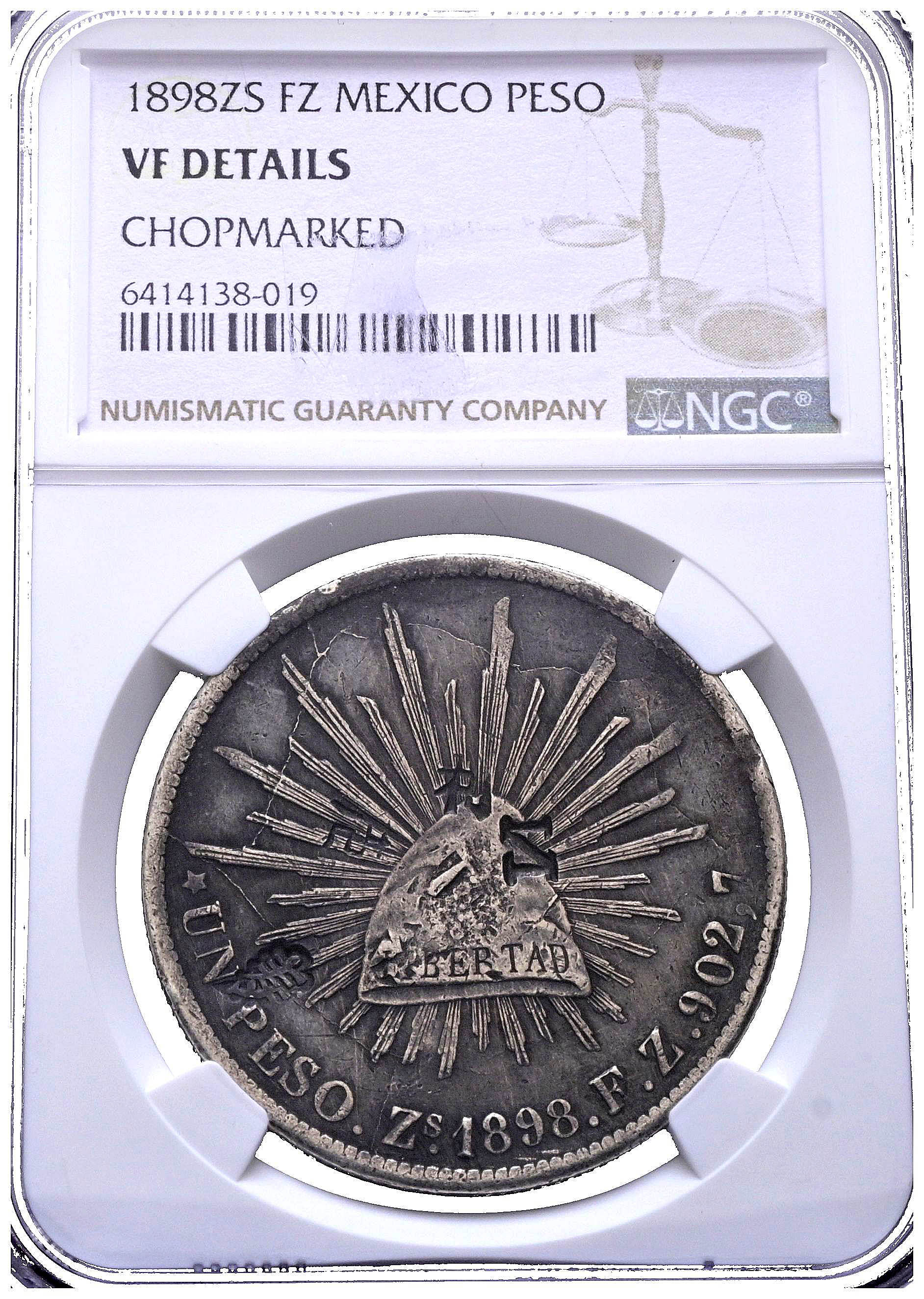 MÉXICO. 1 Peso. (Ar. 27,00g/39mm)*. 1898. Zacatecas FZ. (Km#409.3). Encapsulado por NGC VF Details, Chopmarked. *Peso y medidas teóricos.