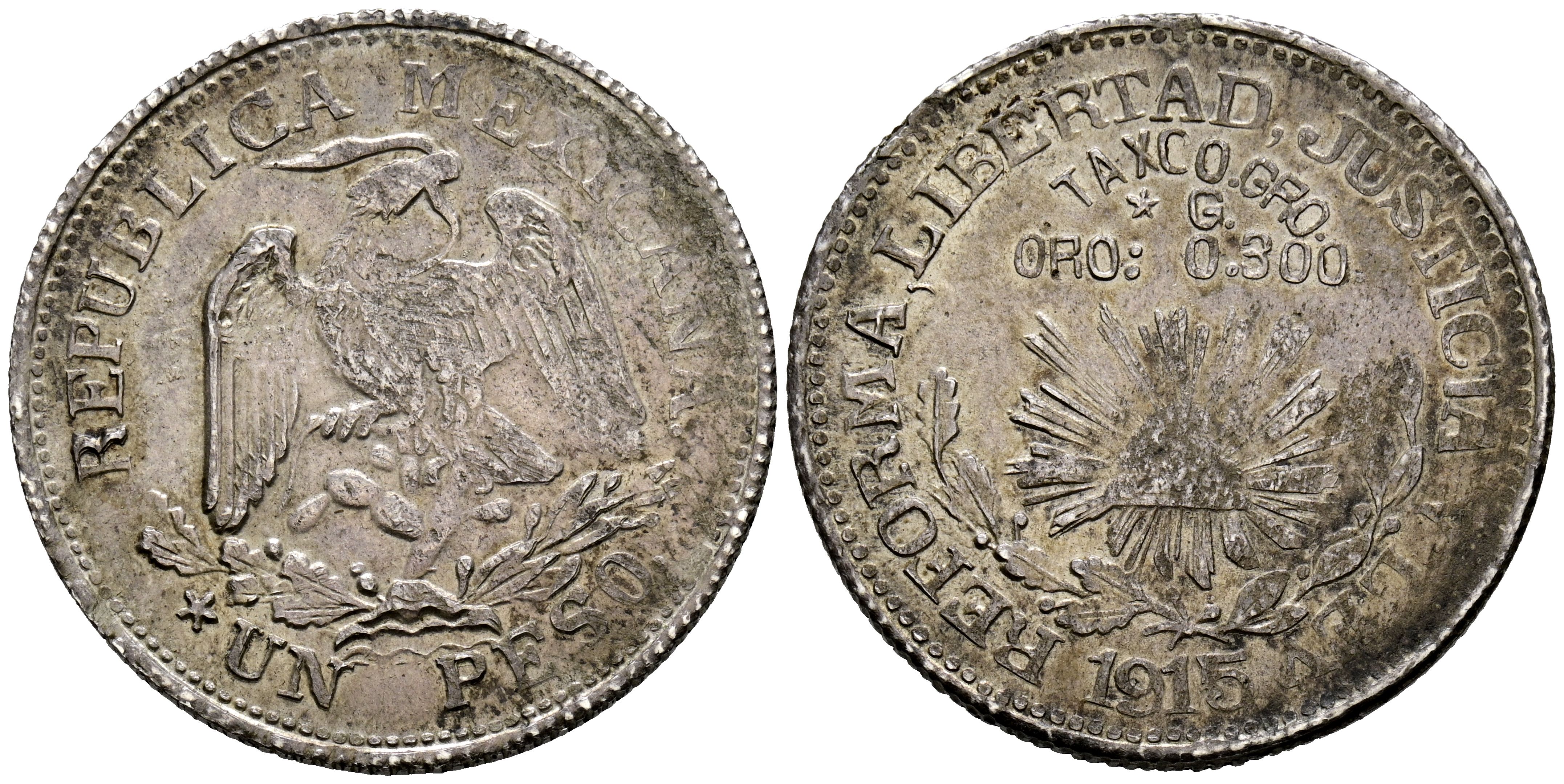 MÉXICO. 1 Peso. (Ar. 9,63g/30mm). 1915. Estado de Guerrero. Periodo Revolucionario. (Km#674). MBC+. Bonita pátina. Escasa e histórica moneda que incluye en su composición 0,3 gramos de oro.