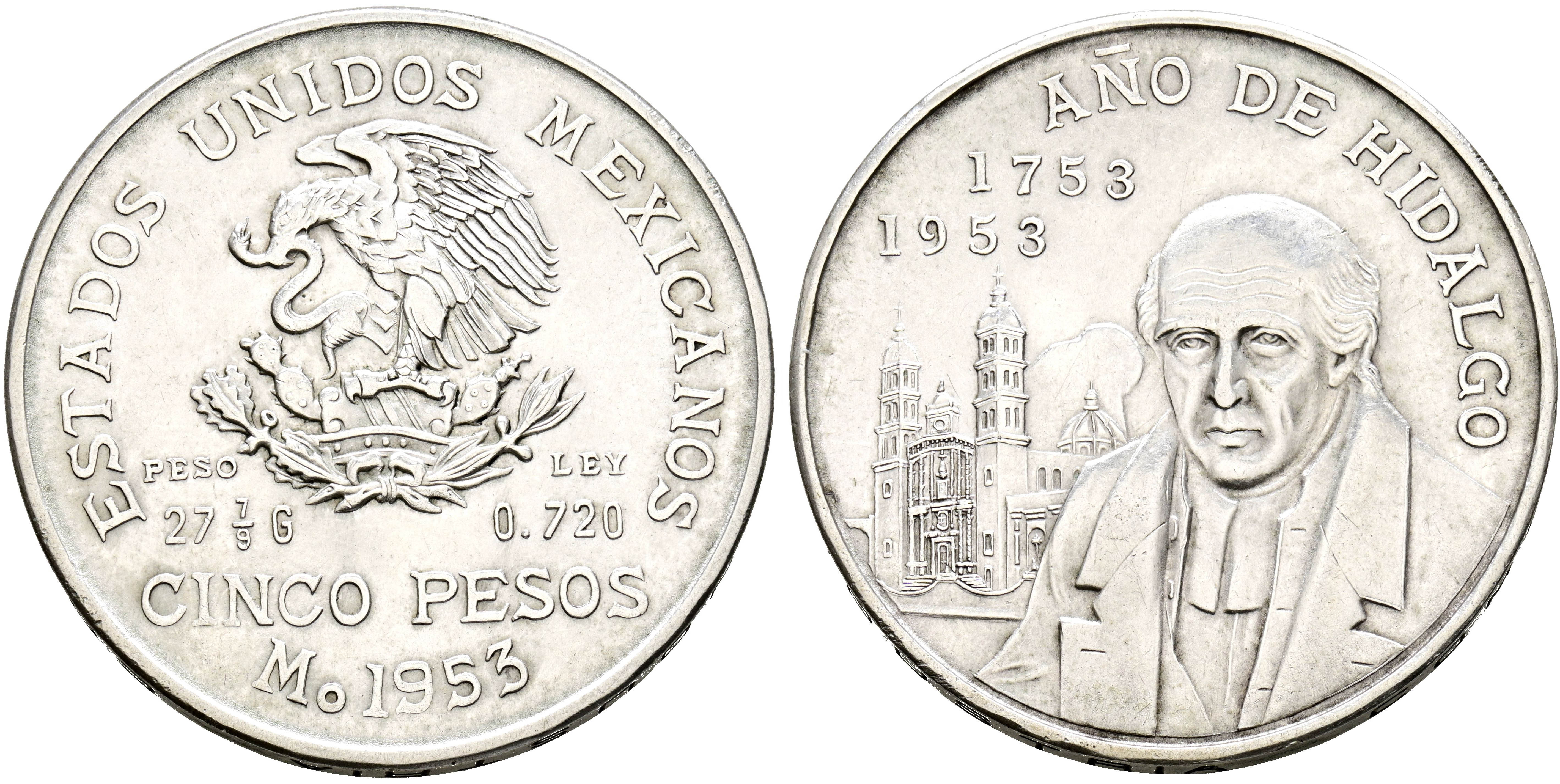 MÉXICO. 5 Pesos. (Ar. 27,85g /40mm). 1953. Bicentenario de Hidalgo. (Km#468). EBC.