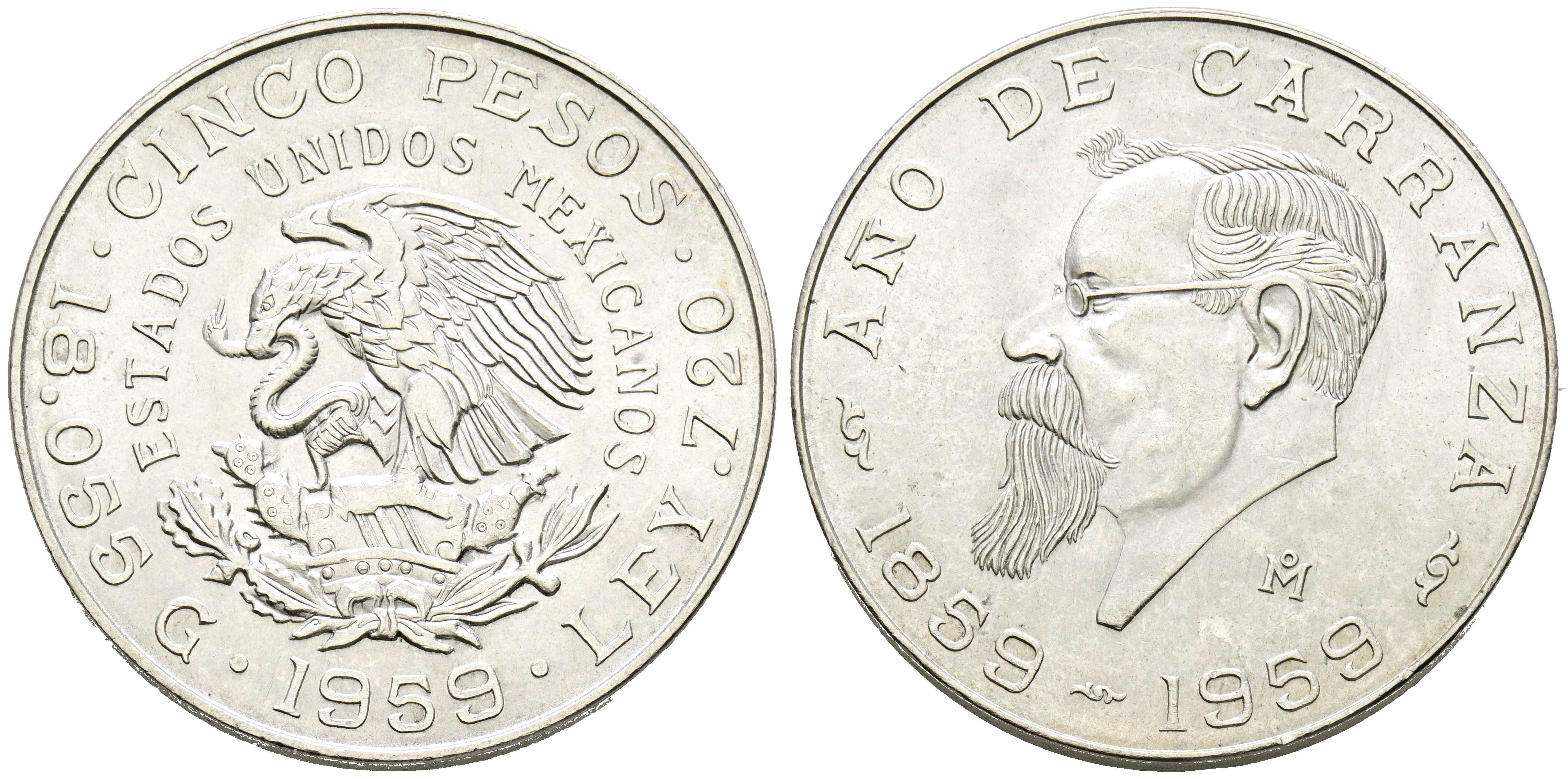 MÉXICO. 5 Pesos. (Ar. 18,12g /36mm). 1959. Año de Carranza. (Km# 471). EBC-.