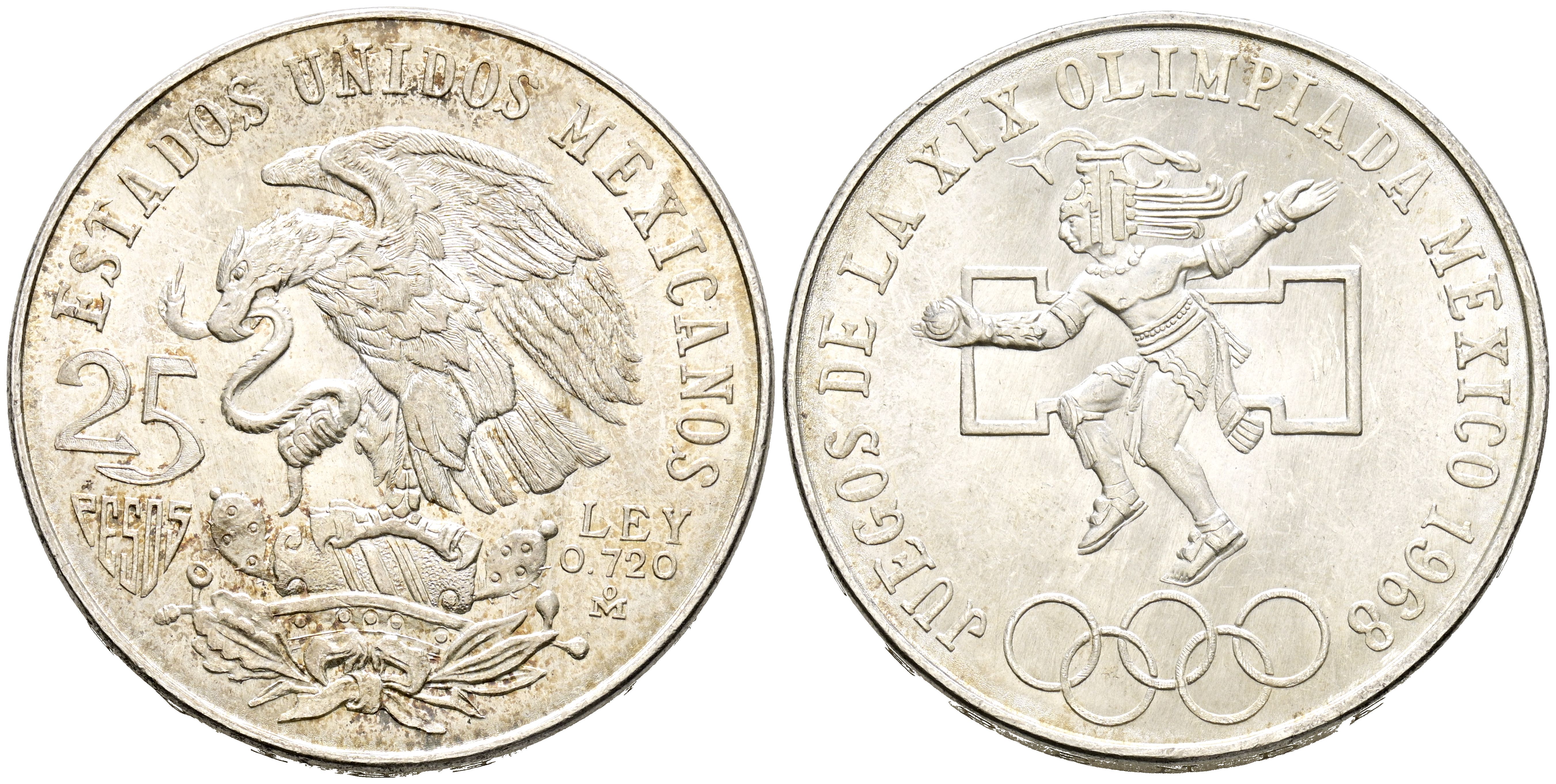 MÉXICO. 25 Pesos (Ar. 22,64g/38mm). 1968. Juegos Olímpicos de México 68. (Km#468). EBC+.