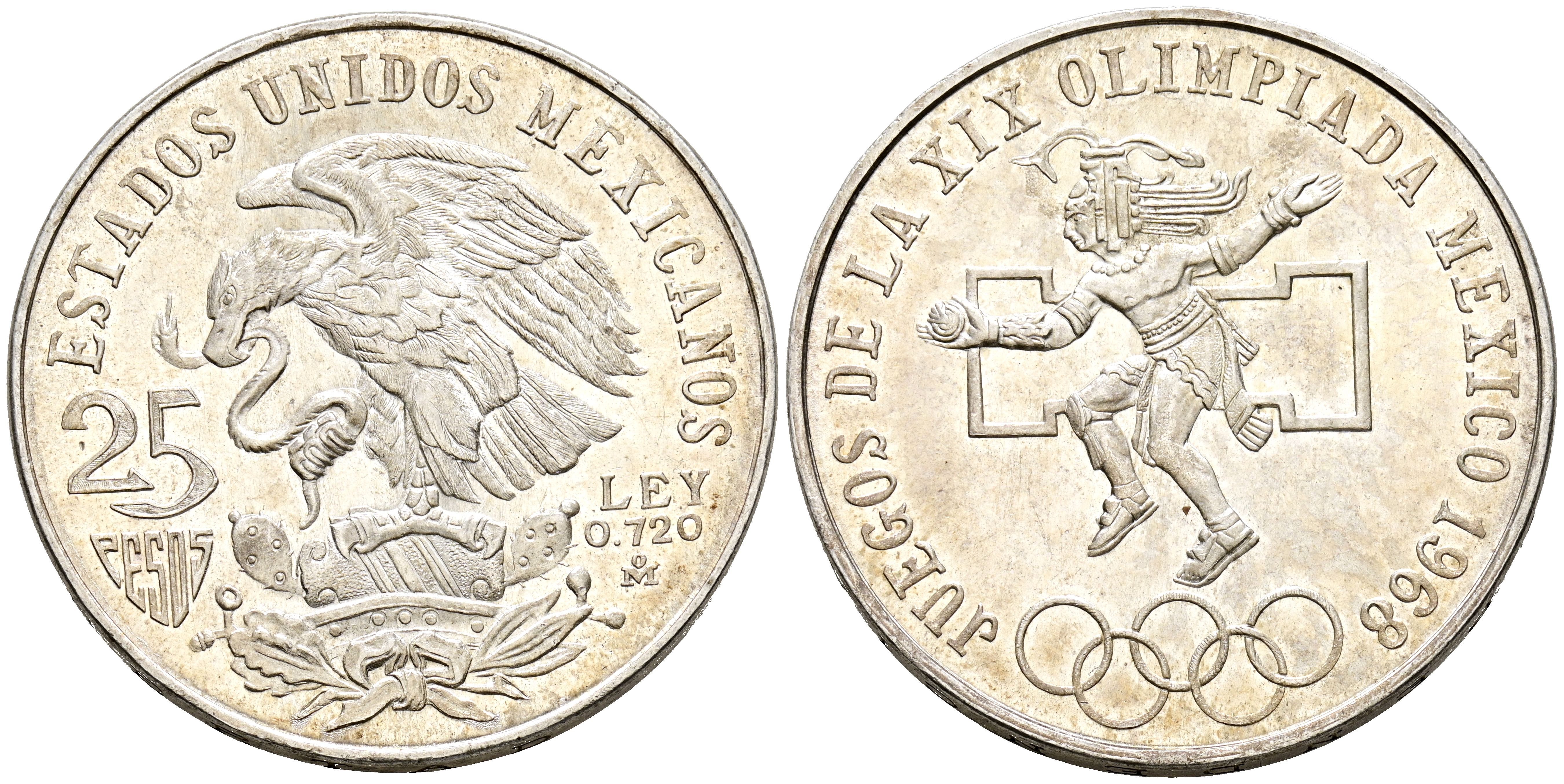 MÉXICO. 25 Pesos (Ar. 22,47g/38mm). 1968. Juegos Olímpicos de México 68. (Km#468). EBC. Rayitas.