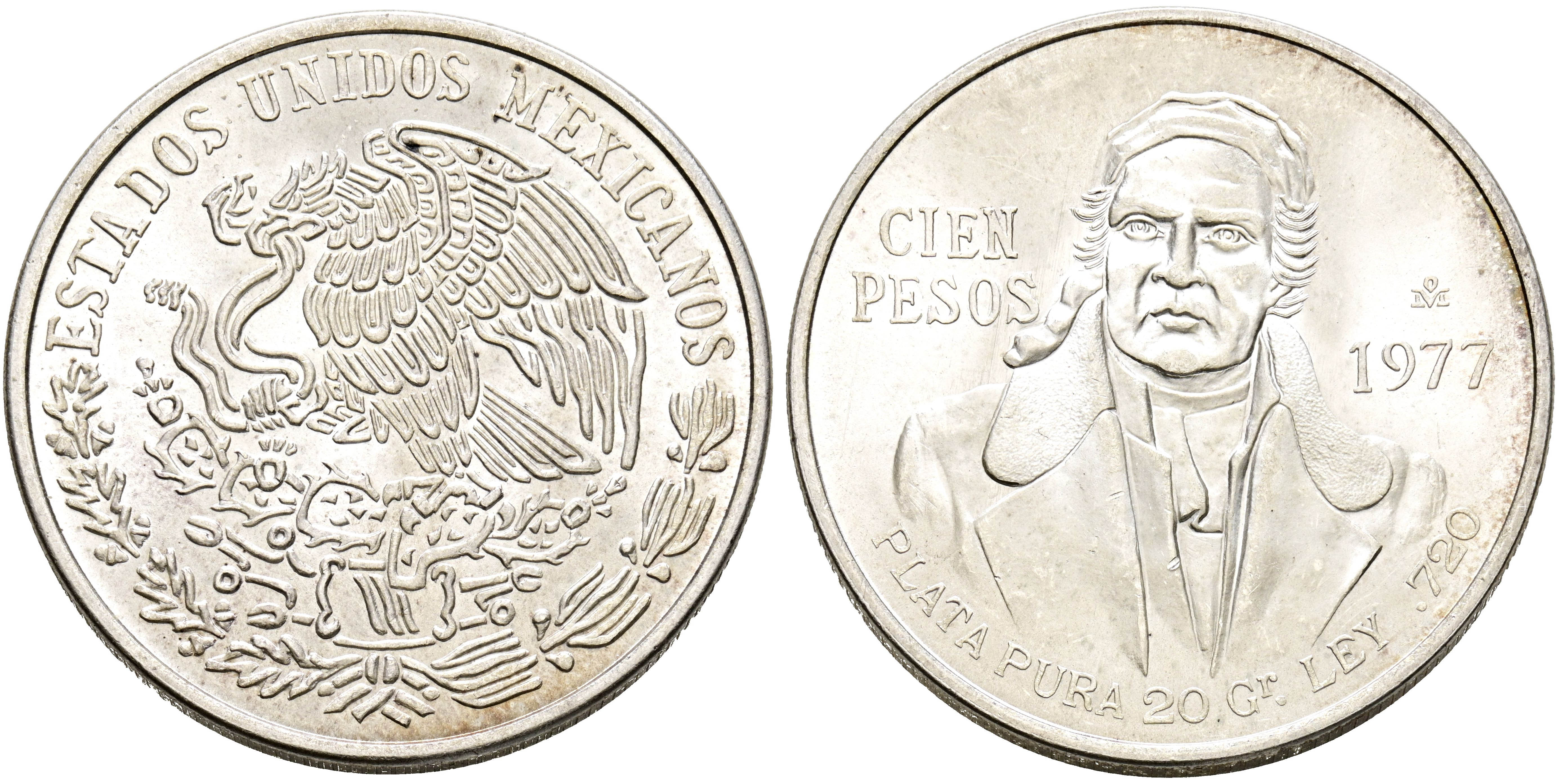 MÉXICO. 100 Pesos. (Ar. 27,76g/39mm). 1977. (K# 483.1). SC.