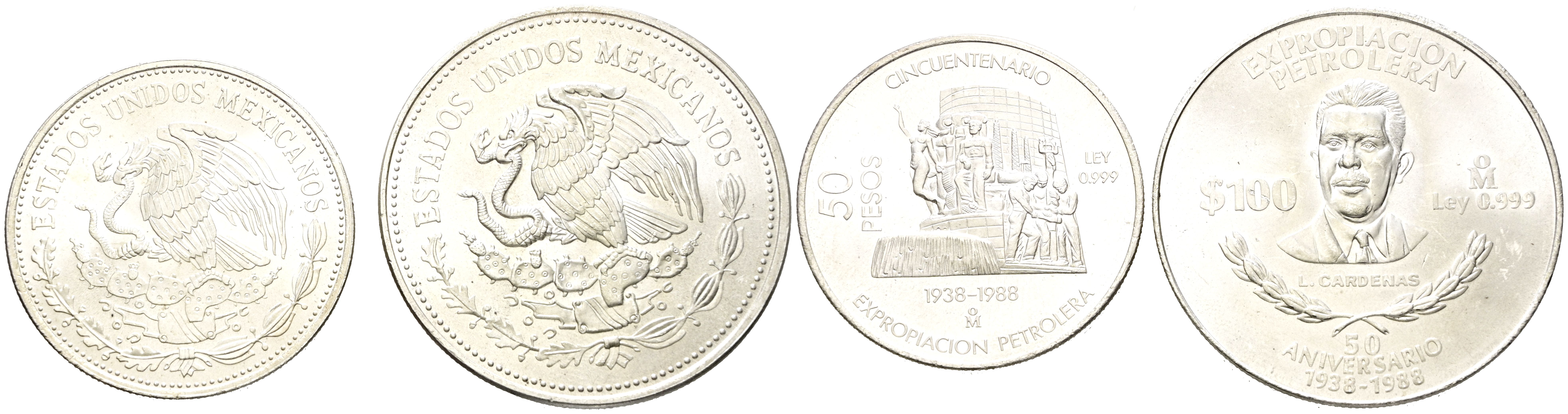 MÉXICO. Pareja de 50 y 100 Pesos conmemorativas de la Expropiación Petrolera. 1988. SC. Escasa tirada. A EXAMINAR.