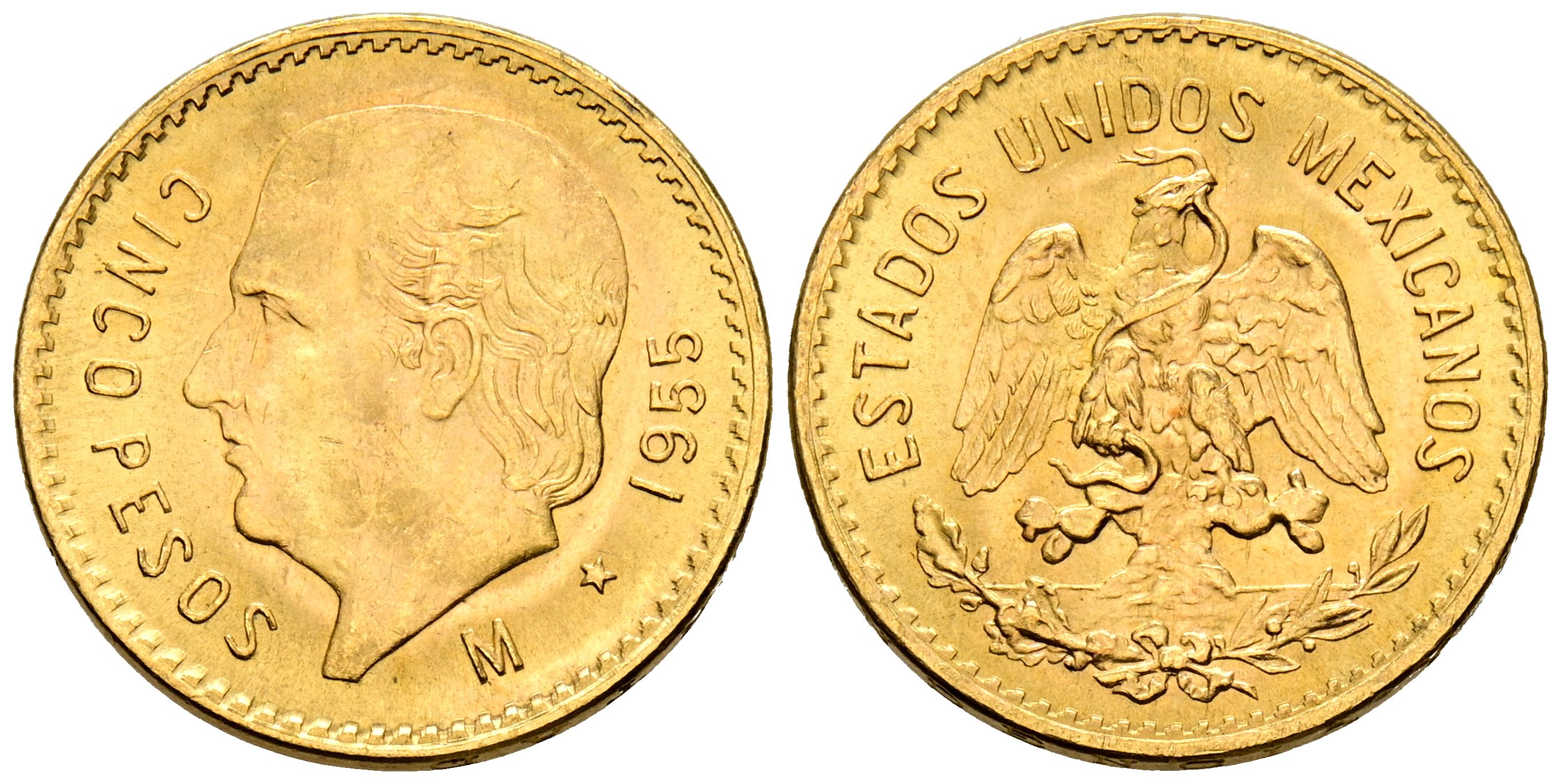 MÉXICO. 5 Pesos. (Au. 4,14g/19mm). 1955. Miguel Hidalgo. Reacuñación oficial. (Km# 464). SC-.