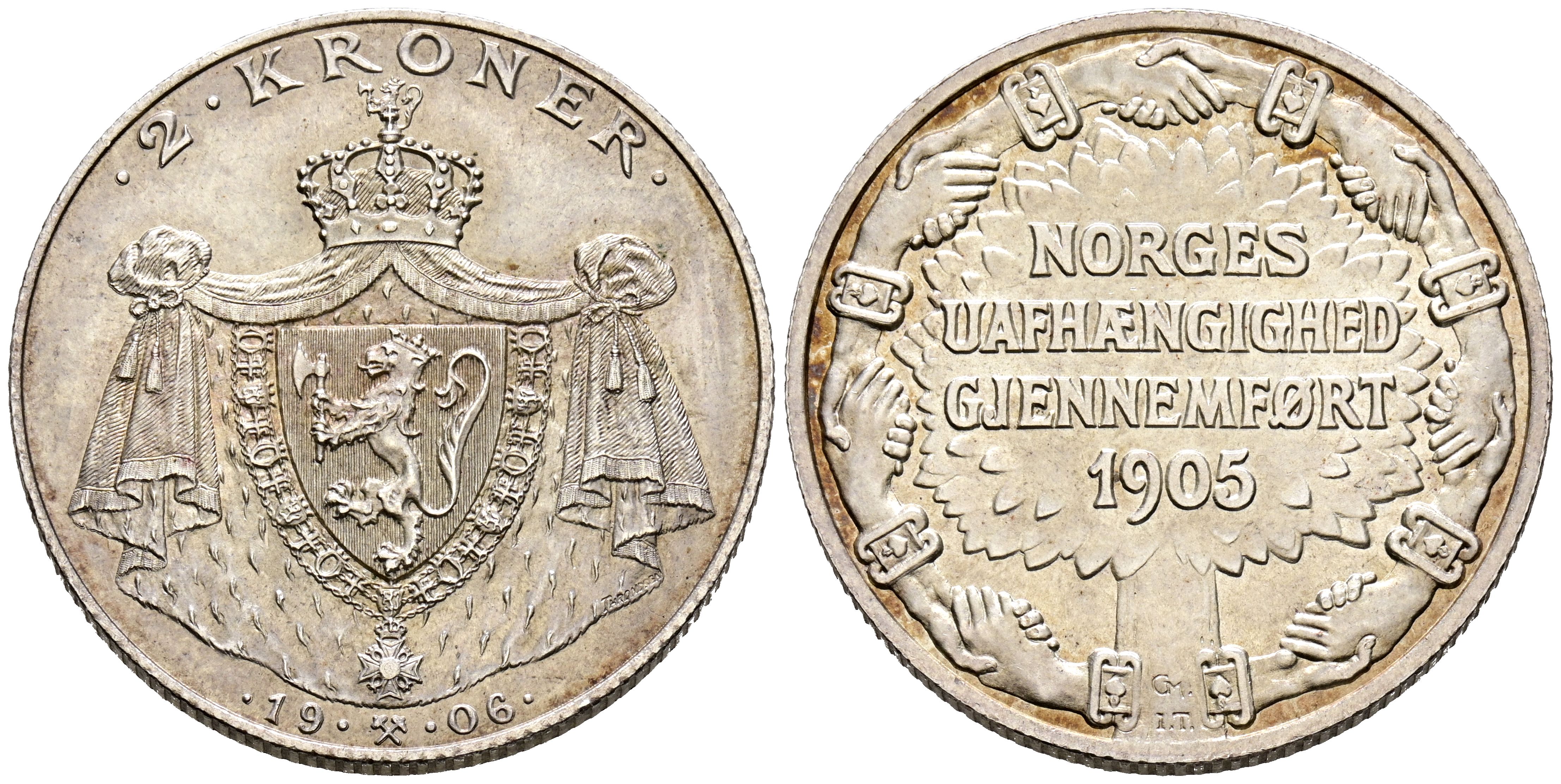 NORUEGA. 2 Coronas. (Ar. 15,00g/31mm). 1906. Independencia de Noruega. (Km#363). EBC+. Brillo original.