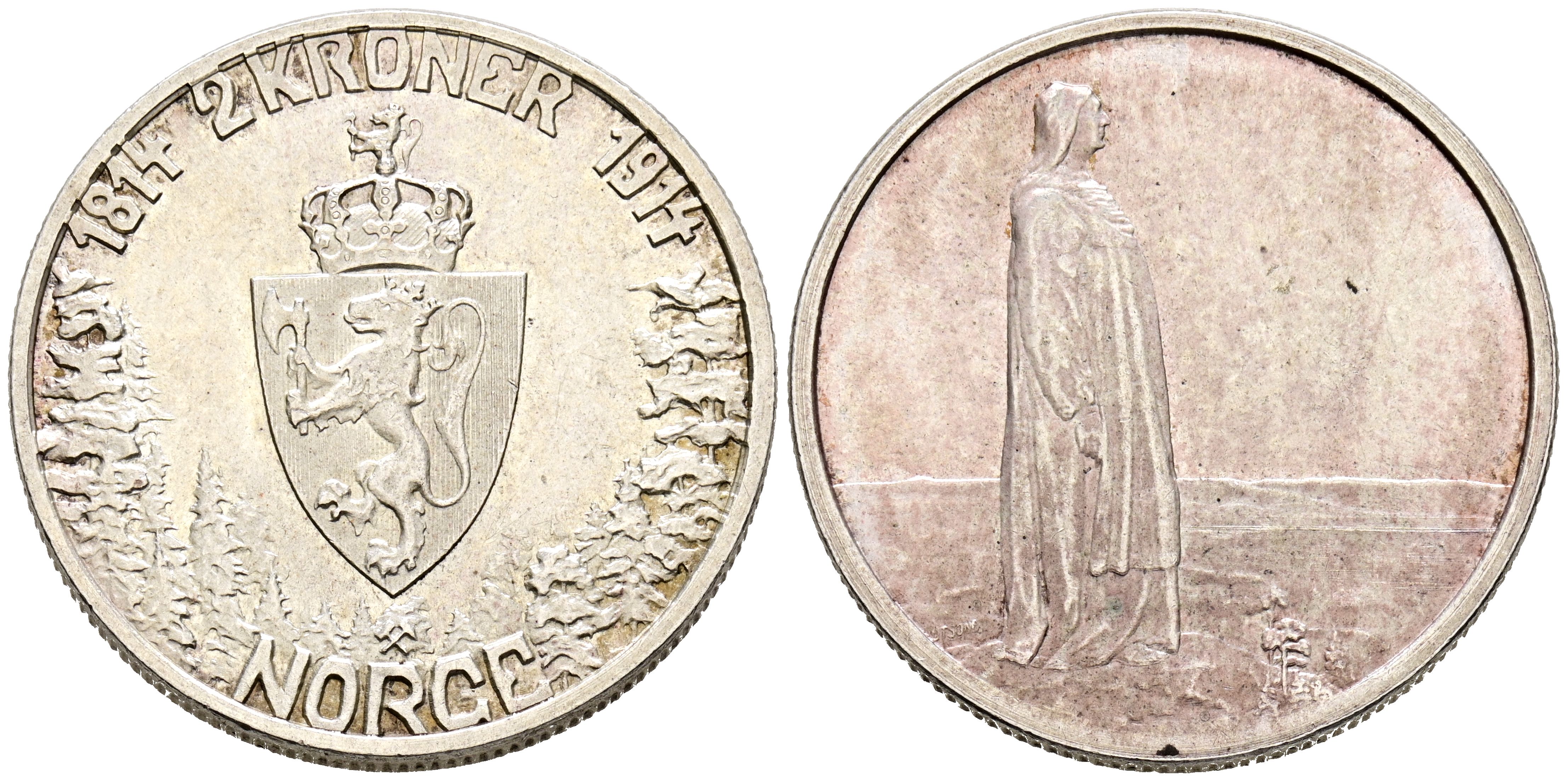 NORUEGA. 2 Coronas. (Ar. 15,00g/31mm). 1914. Centenario de la Constitución. (Km#377). MBC+. Bonita pátina rosada.