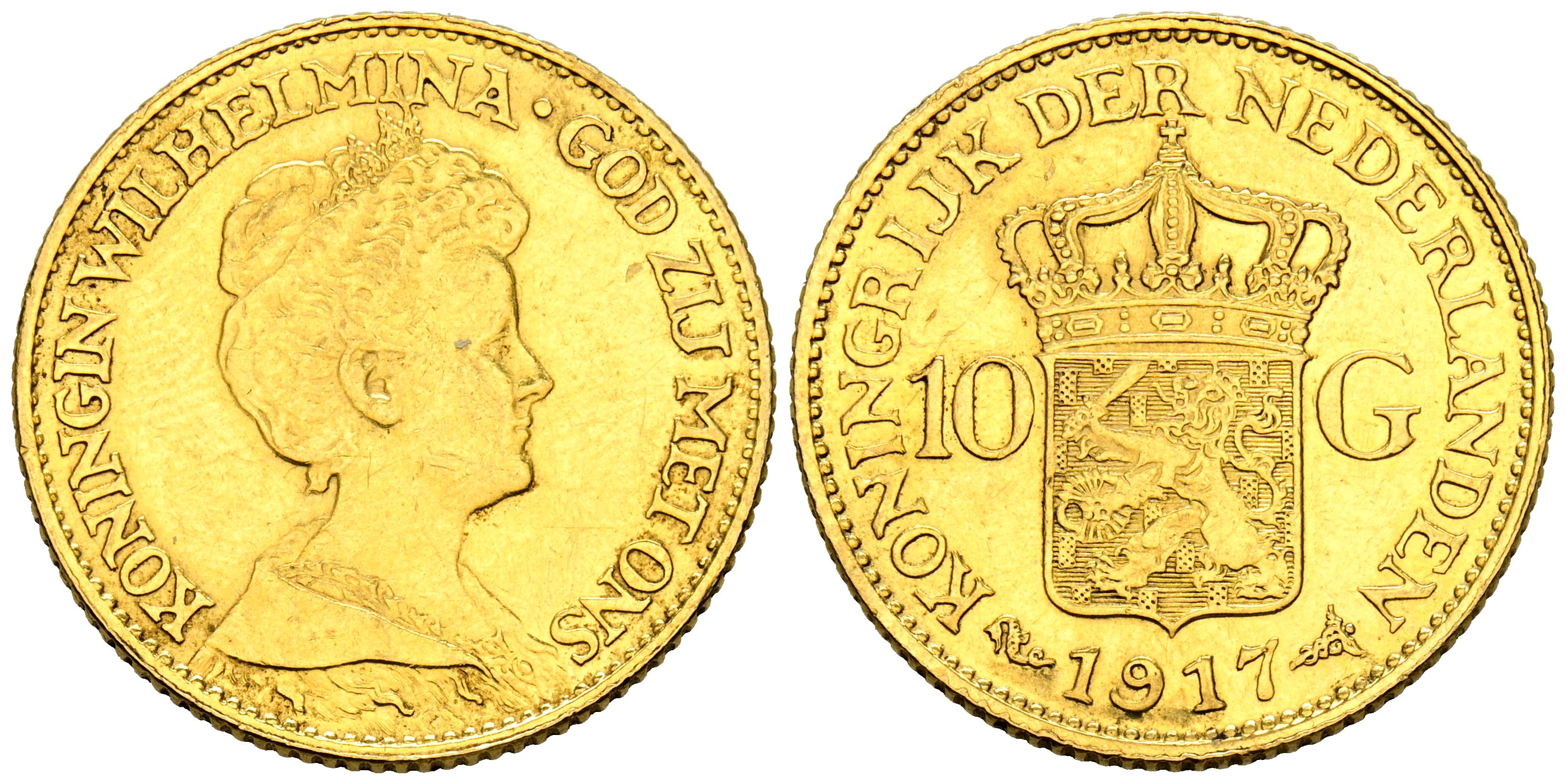 PAÍSES BAJOS, Wilhelmina. 10 Gulden. (Au. 6,72g/22mm). 1917. (Km#149). MBC+. Limpiada.