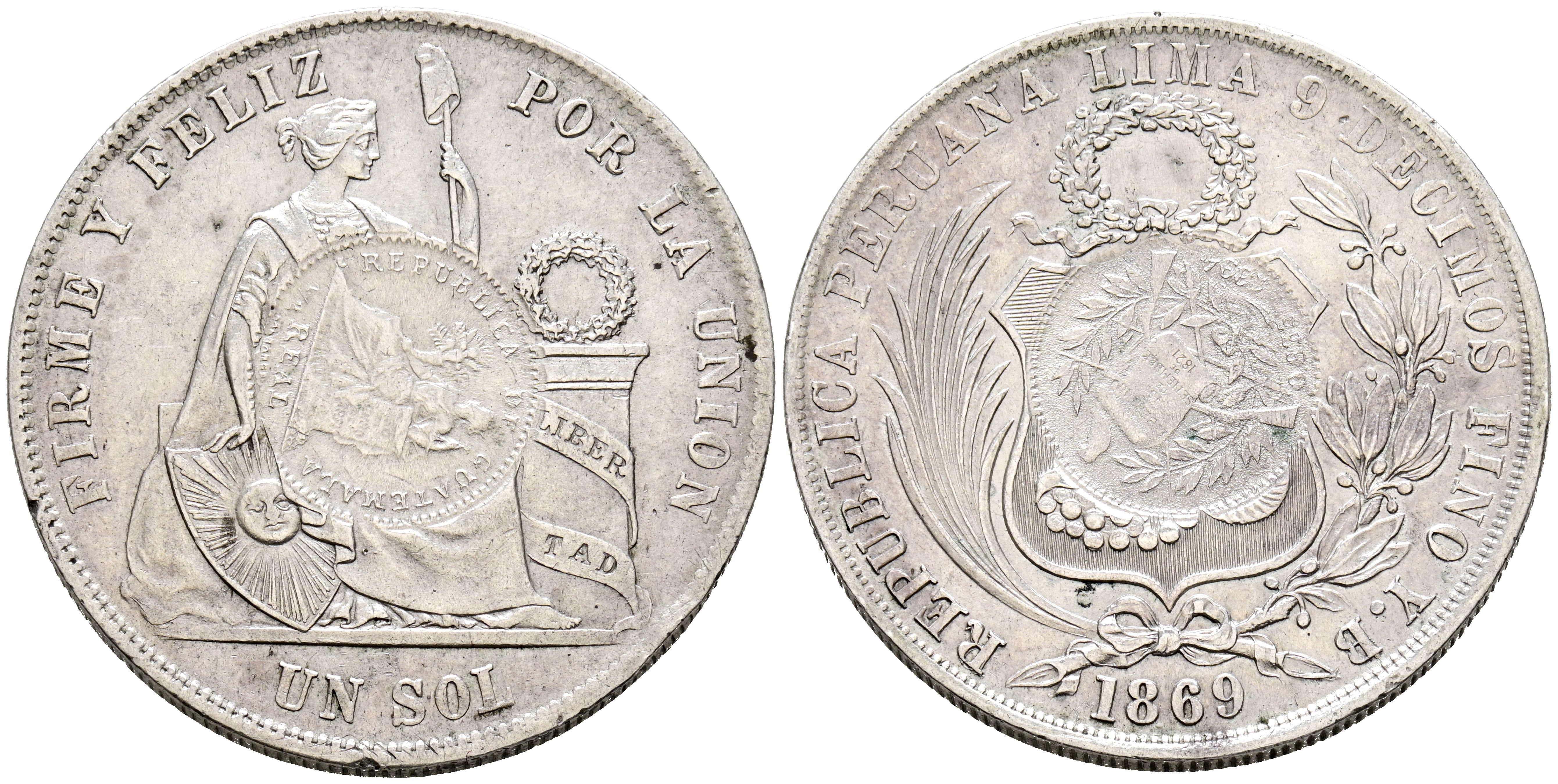 PERÚ. 1 Sol. (Ar. 24,88g/38mm). 1869. Lima YB. (Km#196). Resellos de Guatemala de 1/2 Real de 1894. (De Mey 720 y 721). MBC+. Resellos A Examinar.