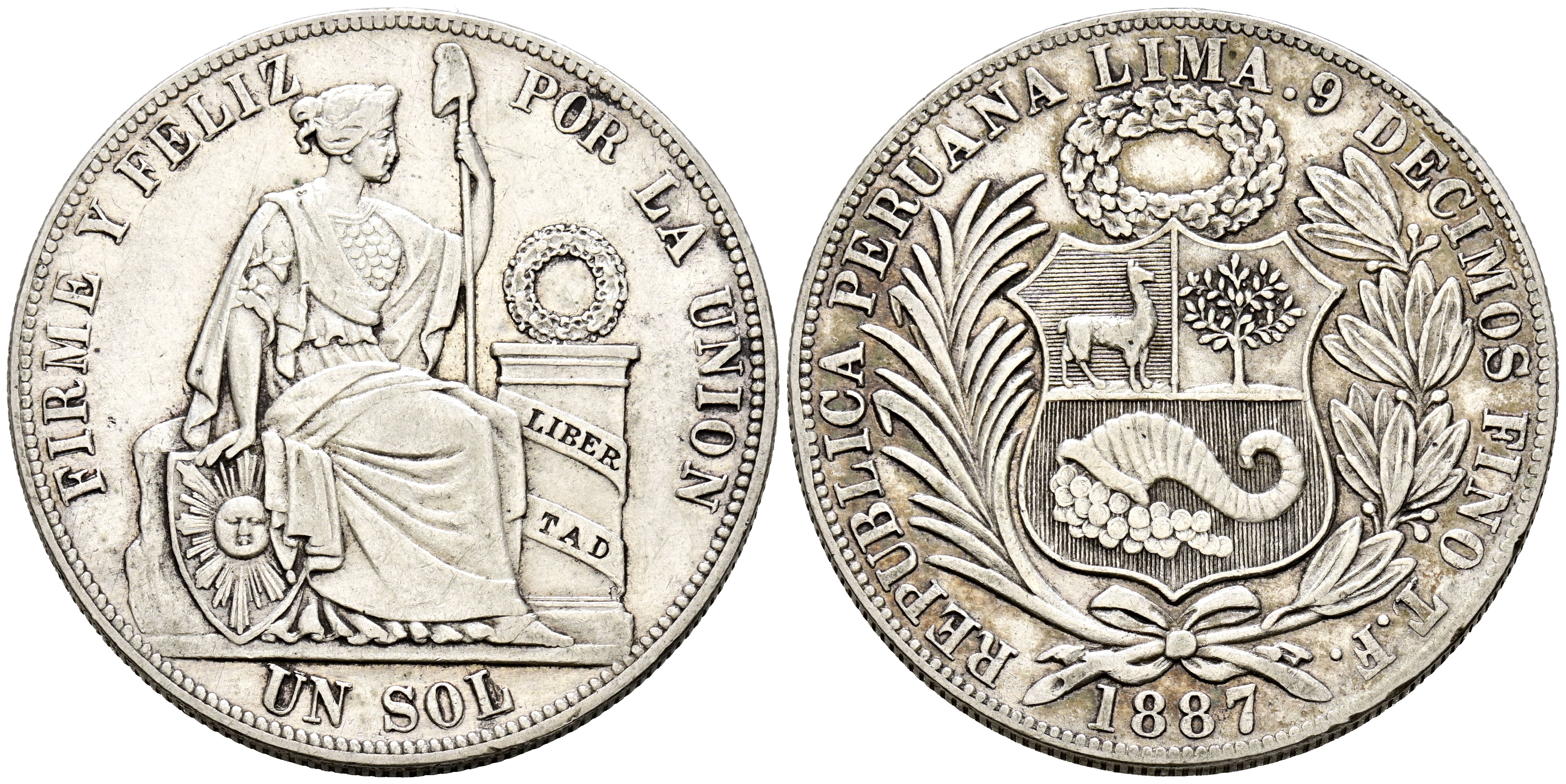 PERÚ. 1 Sol. (Ar. 24,95g/37mm). 1887. Lima TF. (Km#196). MBC+.