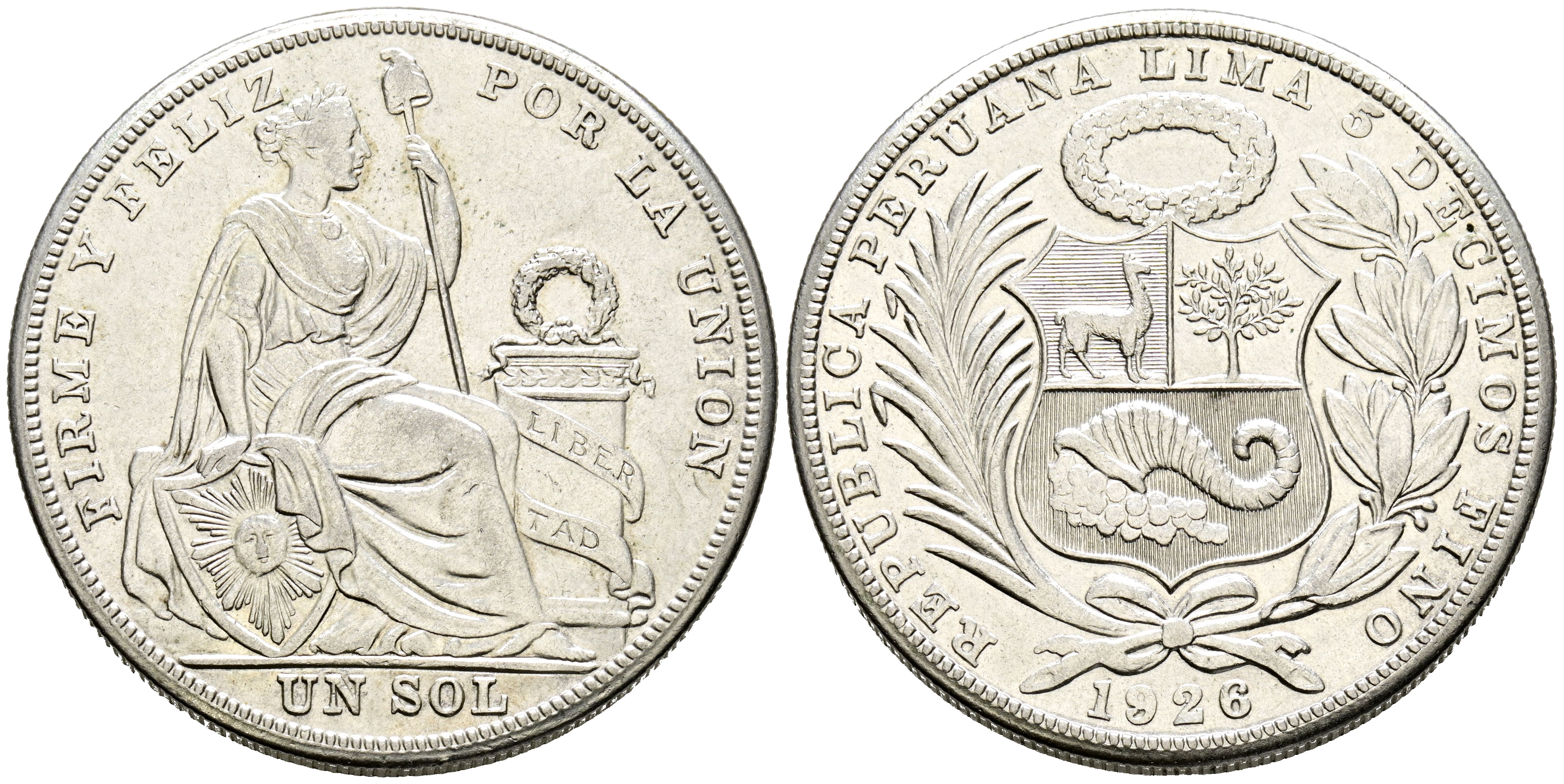 PERU. 1 Sol. (Ar. 25.03g/37mm). 1926. Lima. (Km#218.1). EBC.